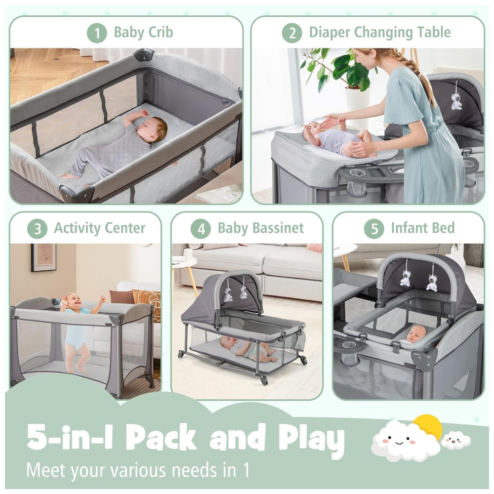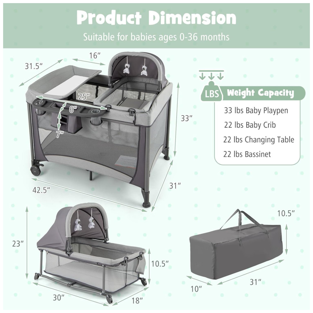 Design 4 em 1: Combina cercadinho, berço de cabeceira, trocador de fraldas e cama de viagem no produto, este playard para bebês é adequado para bebês recém nascidos de 0 a 36 meses e acompanha o crescimento do bebê. Depois de retirar o berço de viagem, o amplo espaço permite ao bebé praticar ficar em pé e caminhar contra as paredes de malha circundantes.