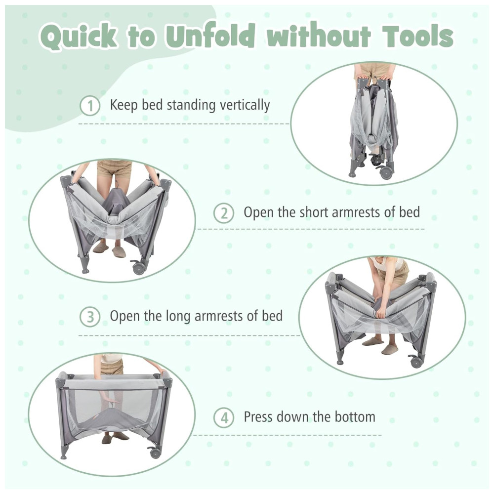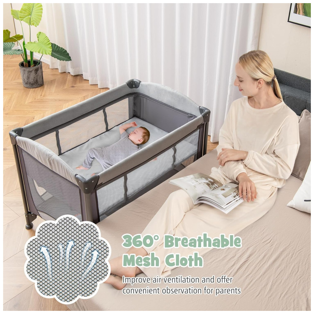 Conveniente para babá: Este playard vem com rodas traváveis para facilitar a movimentação e ficar imóvel para ser servido como berço de cabeceira. E está equipado com paredes de malha para ventilação adequada e fácil babá.