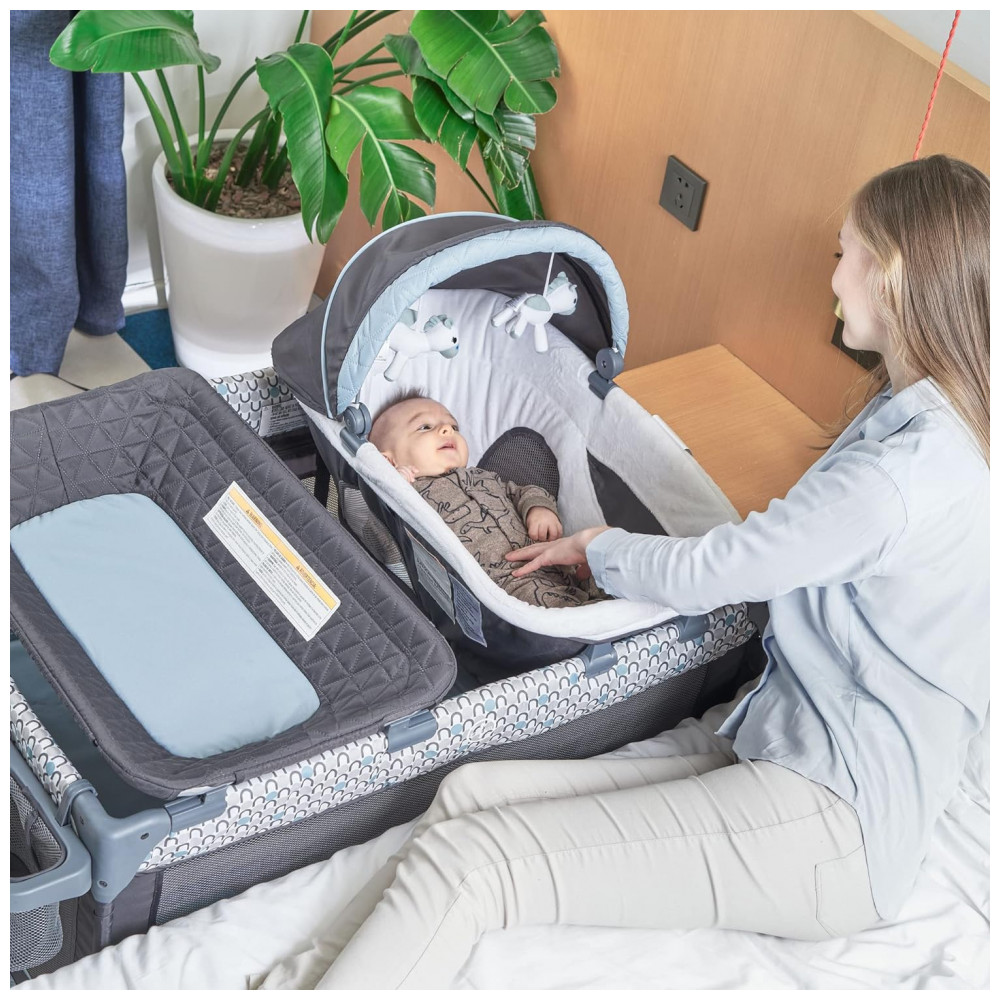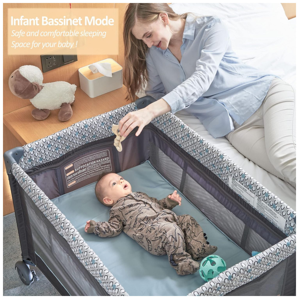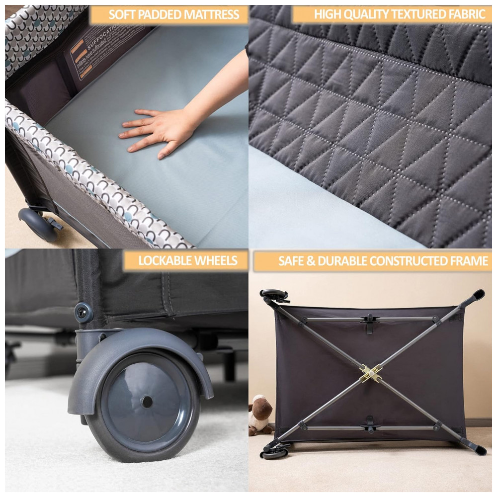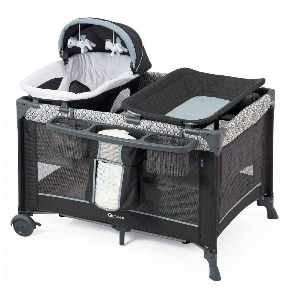 Berço Cercado Portátil 5 em 1 com Trocador de Fraldas Dossel e Rodas Qutanix Cinza e Preto