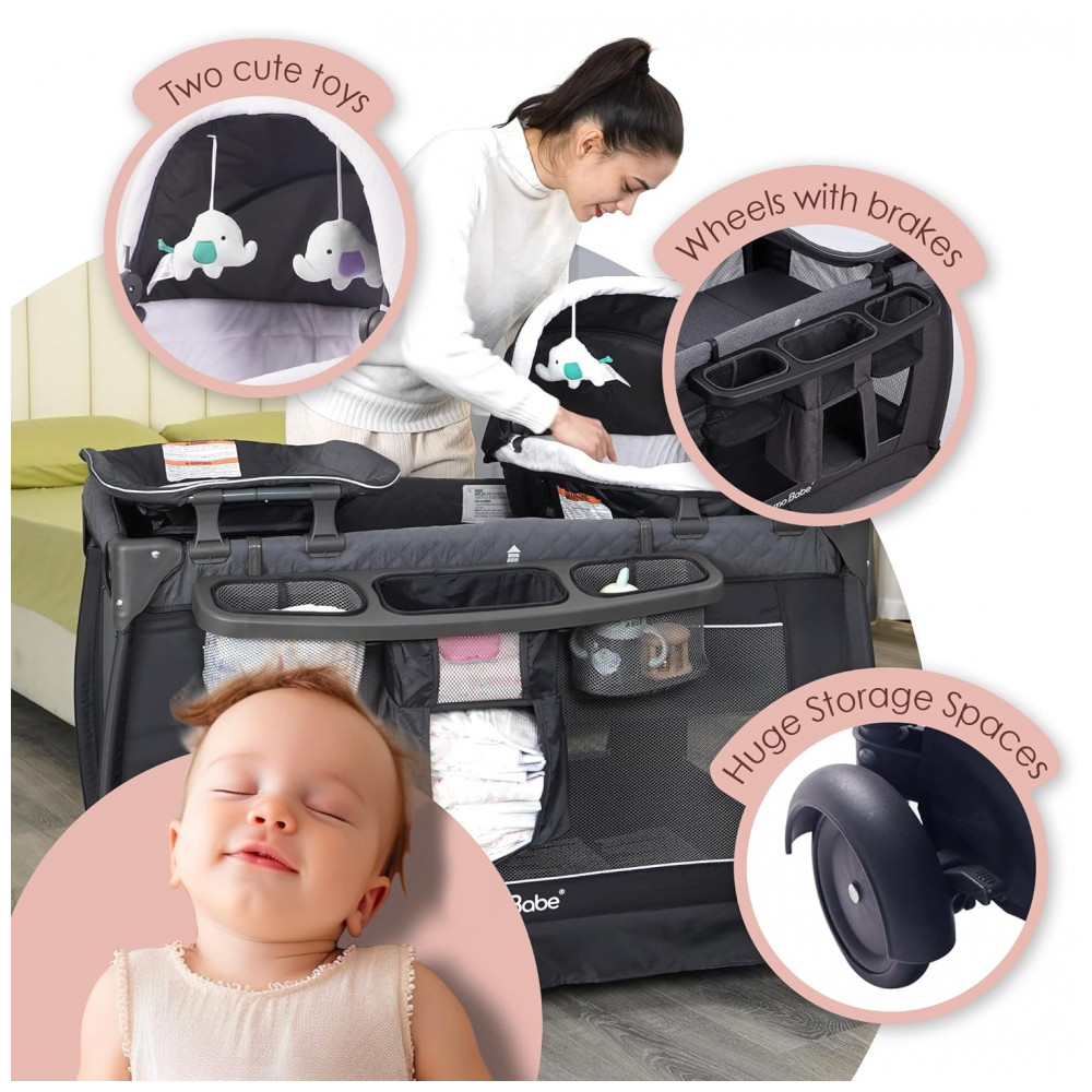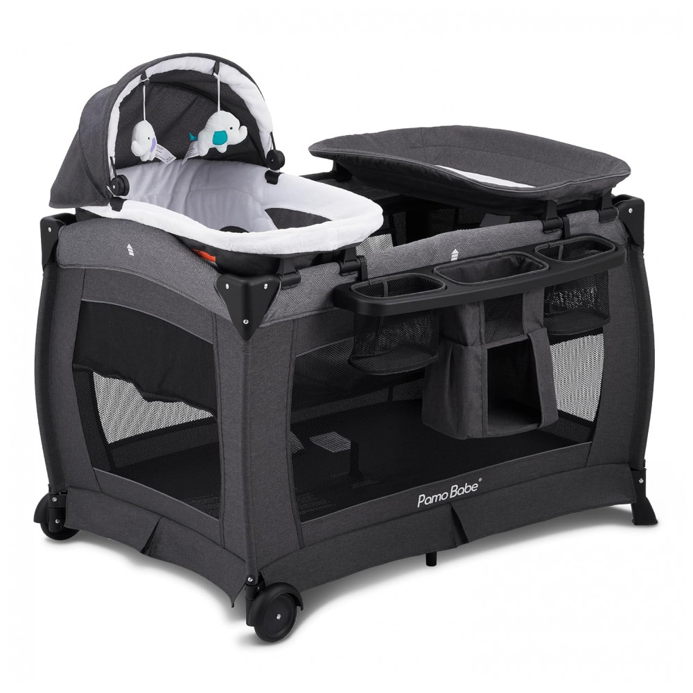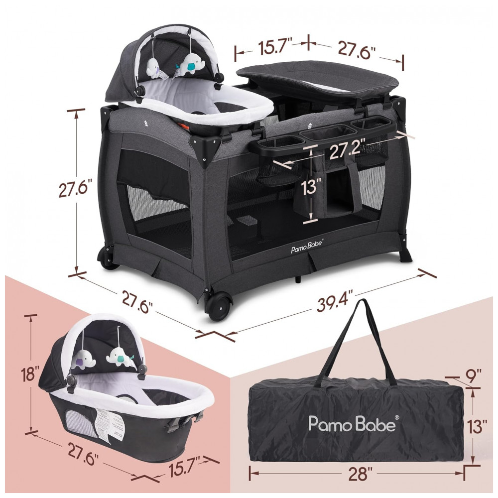 Berço Cercado Portátil com Colchão e Trocador para Recém Nascidos Pamo Babe Preto e Cinza