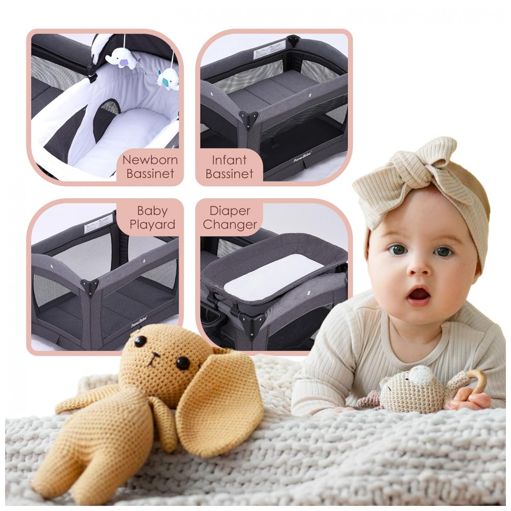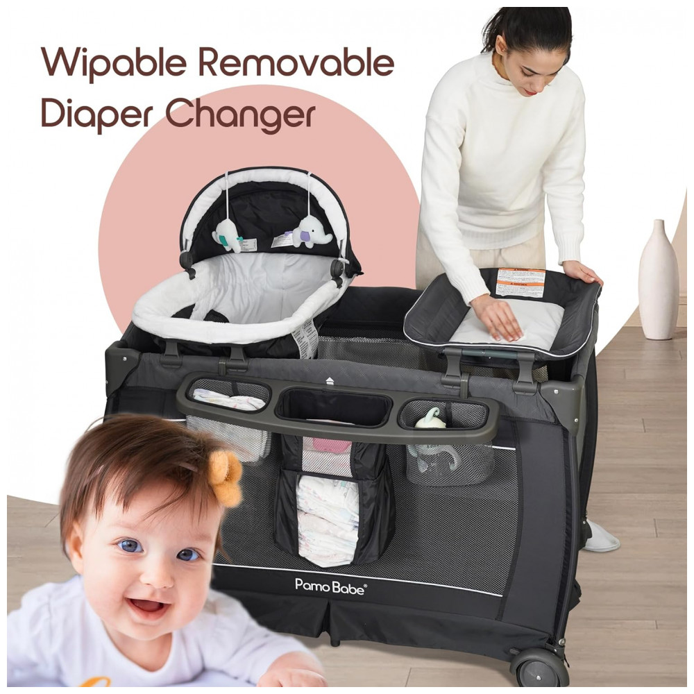 Área de recreação para bebês com berço removível, ninho macio para dormir, trocador limpo e organizador de fraldas resistente, berço prático 5 em 1. Um berço totalmente funcional que você vai adorar.