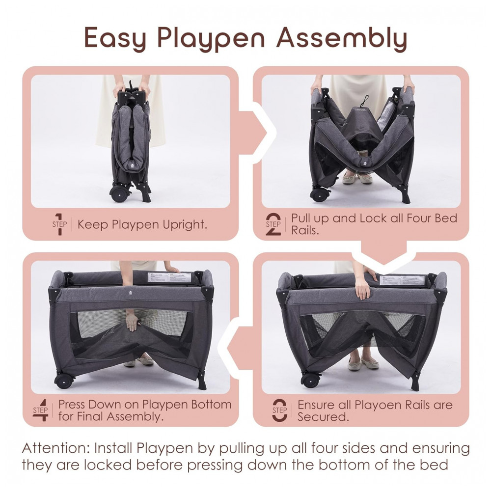 Muito fácil de montar, o playard de viagem para bebês não requer muita configuração e pode ser zenado ou remontado em minutos. Basta encaixar a estrutura do berço no lugar e o berço estará pronto para uso. Também é fácil dobrar e embalar ou remontar em segundos, sem qualquer estresse ou etapas complicadas.