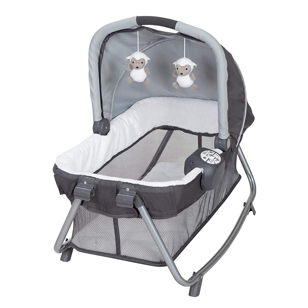 O berço Rock A Bye removível se converte em uma cadeira de balanço independente e vem com 2 brinquedos, um dossel e alça de transporte, tecido de pelúcia e laterais de malha para ventilação adequada.