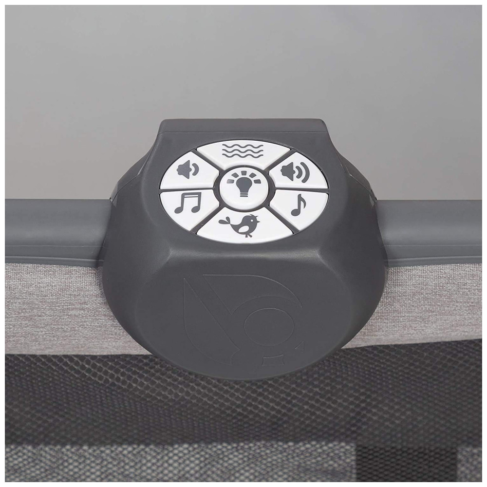 O playard inclui um berço completo removível, trocador e um organizador de luxo para os pais. O fácil mecanismo de travamento com uma mão torna o playard estável e pode ser movido de um lugar para outro com rodas grandes e preso com freios. Também está incluída uma conveniente sacola de viagem, zenamento. Seu bebê vai curtir a central de música eletrônica com controle de volume, luz noturna e vibração que inclui dois estilos de música e sons da natureza.