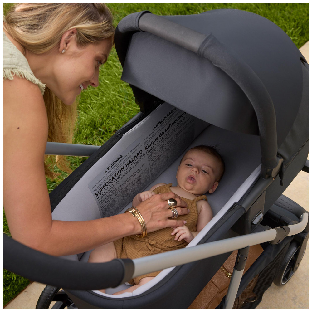A estrutura conta com dossel com proteção solar UPF 50+ e extensão frontal, ajudando a bloquear a incidência direta de luz e criando um ambiente mais protegido. A abertura tipo peek-a-boo permite a visualização rápida do bebê sem necessidade de interromper o deslocamento ou reposicionar o dossel.