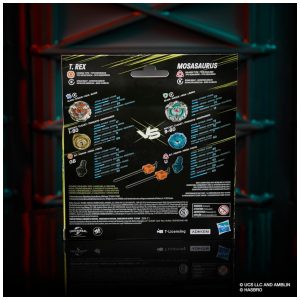 O conjunto utiliza tops licenciados com visual de T. Rex e Mosasaurus, integrando temática de dinossauros da franquia Jurassic World ao sistema Beyblade X. Indicado para usuários a partir de 8 anos, o produto é destinado a uso com Beystadium compatível, vendido separadamente, e não inclui componentes eletrônicos.