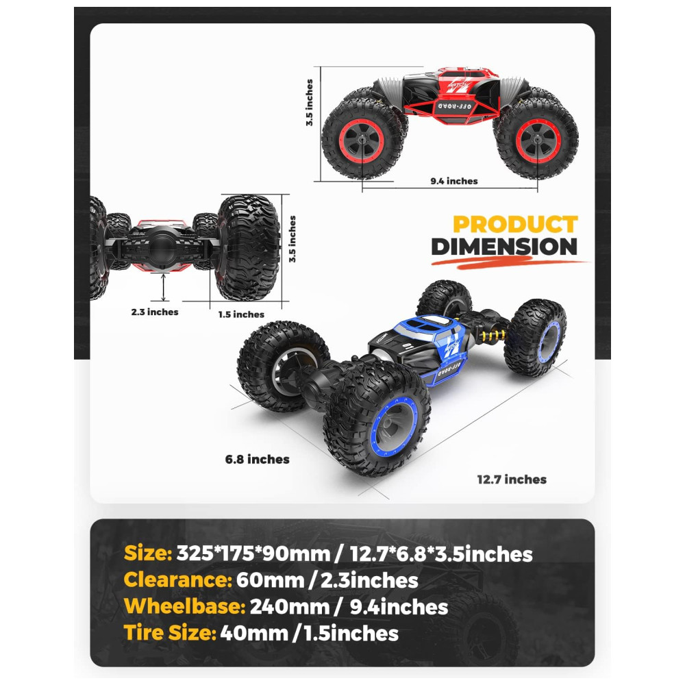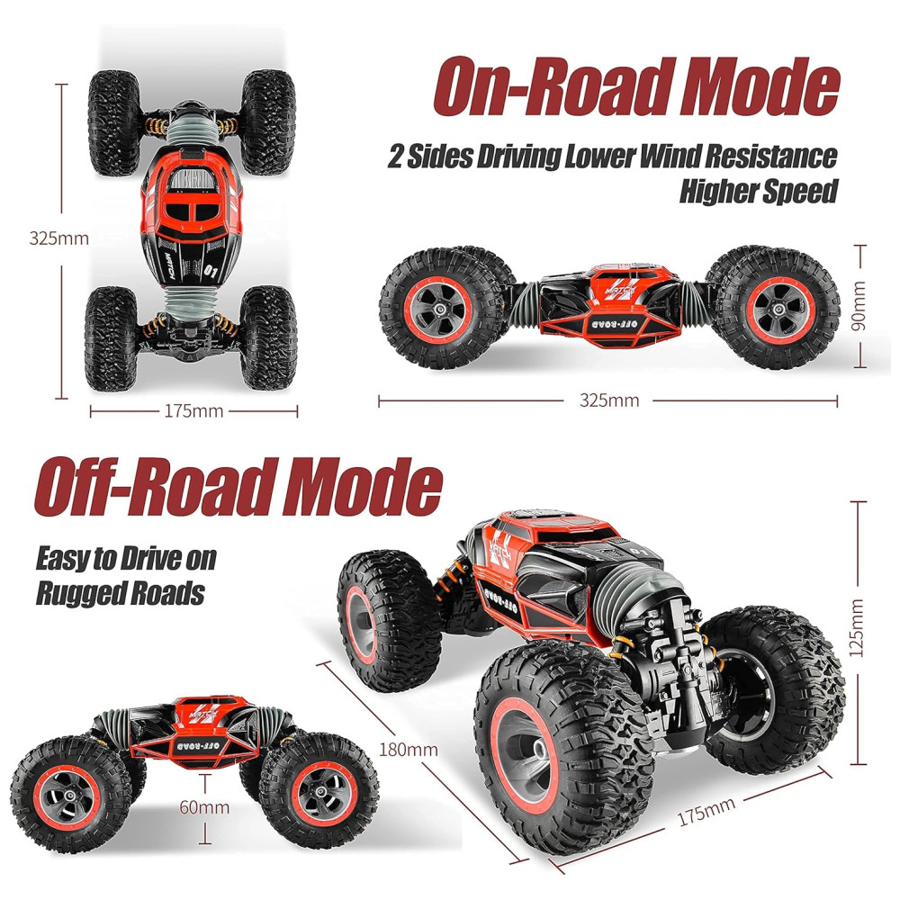 Este carro rc permite que você dirija em ambos os lados devido ao design exclusivo, então você não precisa se preocupar com capotamento do carro, não importa como o veículo vire, você pode continuar a operá lo sem entrar para virar.