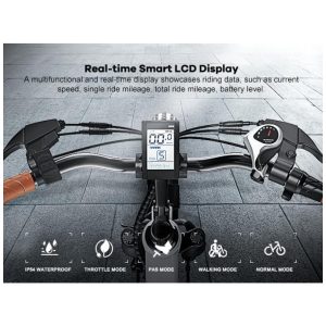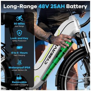 A poderosa Bicicleta Elétrica 1000W Peak possui um motor sem escovas de alta velocidade de 1000W Peak e transmissão de 7 velocidades, tornando subidas íngremes e longos passeios uma brisa, alcançando até 40 km/h, com autonomia de até 80 quilômetros. Esta e-bike de longo alcance oferece eficiência perfeita e equilíbrio de potência para garantir que seu passeio seja extremamente prazeroso. Mais potência, mais diversão, sem medo de subidas íngremes, estável, silenciosa e com menos manutenção do que uma bicicleta elétrica de 350W. Perfeita para adultos que buscam uma bateria duradoura de 80 quilômetros. Com ajuste de suspensão dianteira, absorção de choque no banco e freios de disco duplo, esta e-bike oferece um desempenho de absorção de impactos excepcional, garantindo sua segurança e conforto. Combinada com freios a disco mecânicos dianteiros e traseiros e o sistema EABS, desfrute de uma experiência de pedalada confortável e frenagem potente mesmo em terrenos acidentados. A bicicleta elétrica apresenta uma tela LCD resistente à água com 5 modos de pilotagem: modo totalmente elétrico, modo de assistência ao pedal, modo de bicicleta clássica e 5 níveis de assistência ao pedal (PAS) para sua escolha. A tela colorida exibe em tempo real a velocidade, níveis de bateria, distância percorrida e muito mais, facilitando o acompanhamento dos seus passeios de dia e de noite. A função de controle de cruzeiro pode ser ativada e desativada facilmente com o toque de um botão. A Bicicleta Elétrica 1000W Peak da Cybervelo é entregue 90% pré-montada e inclui dois pedais e um selim. Nossa equipe de suporte ao cliente está disponível 24 horas por dia para ajudá-lo com quaisquer dúvidas ou preocupações.