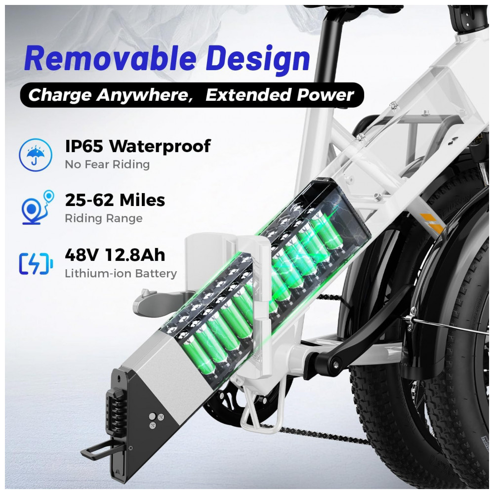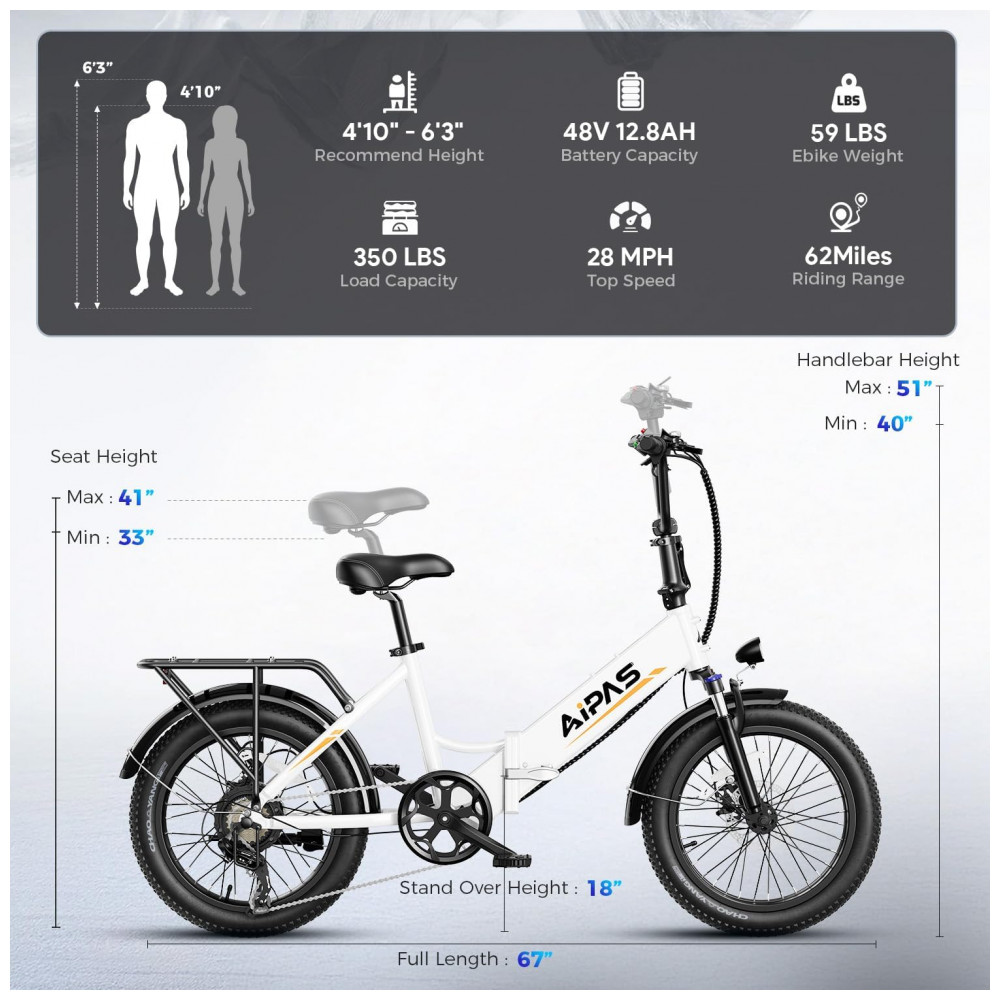 MOTOR POTENTE DE 750W: A bicicleta elétrica dobrável Aipas A2 para adultos conta com um motor sem escovas de 750W, que eleva sua velocidade máxima para 45km/h e a permite conquistar facilmente subidas de 18°. A bateria removível de 48V 12.8Ah garante uma incrível autonomia de 100km por carga. CONFORTO APRIMORADO: A bicicleta elétrica Aipas A2 para adultos possui pneus gordos anti-furo de 20 x 3.0, a suspensão dianteira bloqueável hidráulica melhora ainda mais o conforto absorvendo choques pelo caminho. Além disso, conta com freios a disco mecânicos de 180mm e 7 marchas, tornando-a uma excelente escolha para diversos terrenos. DOBRÁVEL E PORTÁTIL: Com dimensões de 84cm x 51cm x 78cm quando dobrada, a bicicleta elétrica step-through pode ser facilmente guardada no porta-malas do carro ou transportada no metrô, sendo ideal para se deslocar e viajar. CAPACIDADE DE CARGA DE 160kg: A A2 possui um quadro resistente e estável, oferecendo uma experiência de pilotagem segura e confiável para pilotos de todos os tamanhos, além de possuir um bagageiro traseiro para facilitar o transporte de carga. PEDALE COM SEGURANÇA: Com design de botão integrado, luzes dianteiras e traseiras, refletores e sinais de mudança, esta bicicleta elétrica dobrável de 750W garante máxima visibilidade ao pedalar à noite, aumentando a segurança. Seu design de altura baixa remove barreiras, sendo especialmente indicado para idosos, deslocamentos e estudantes universitários. DESIGN HUMANIZADO: A Aipas oferece garantia de 1 ano para problemas de qualidade e orientação técnica vitalícia. A bicicleta elétrica dobrável fat tire é enviada pré-montada, venha experimentar a bicicleta elétrica da Aipas e melhorar sua experiência de ciclismo!