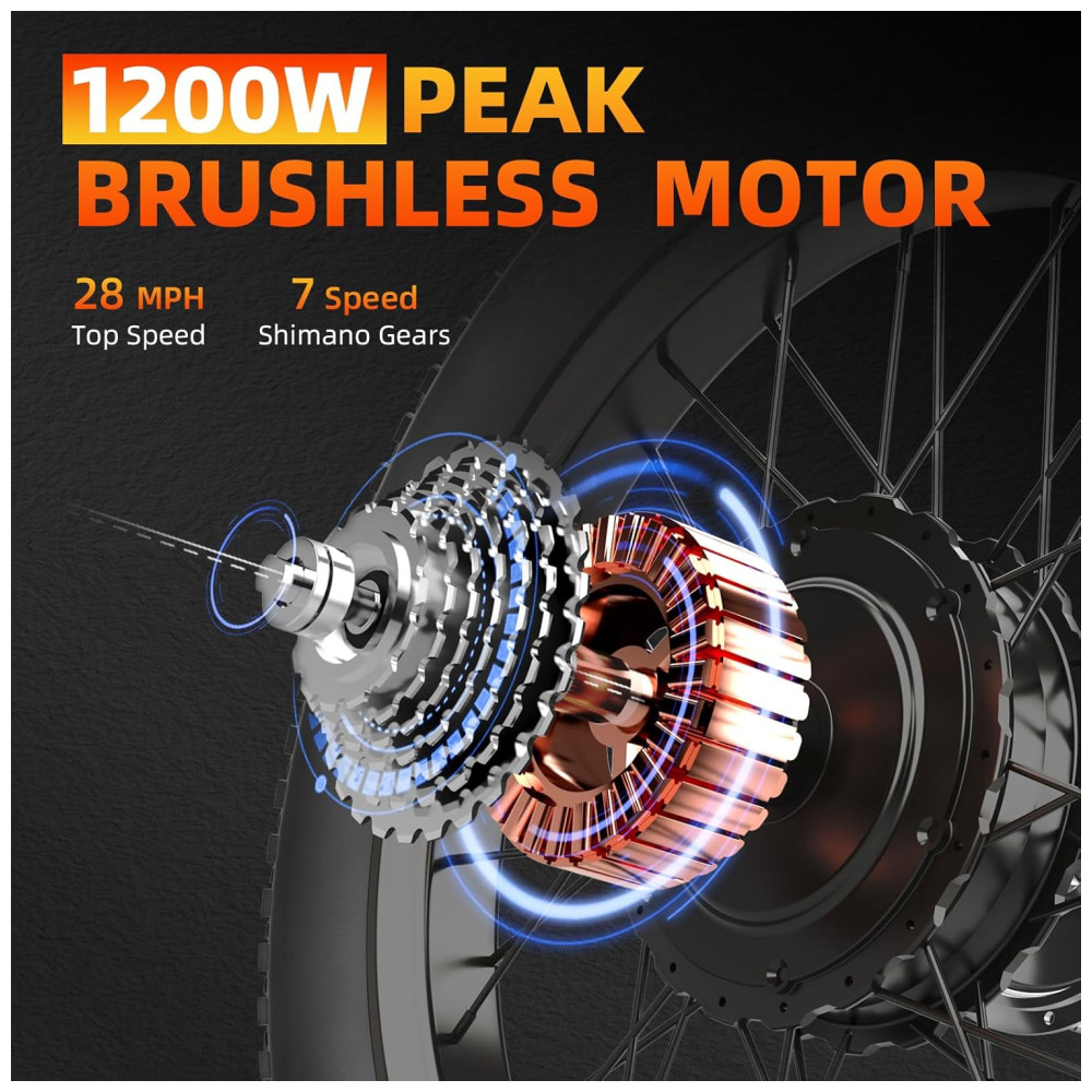 Bicicleta Elétrica de Pneus Largos para Adultos 20" 1200W Mountain Ebike para Comutar Fora de Estrada 7 Velocidades com Assistência de Pedal Bici