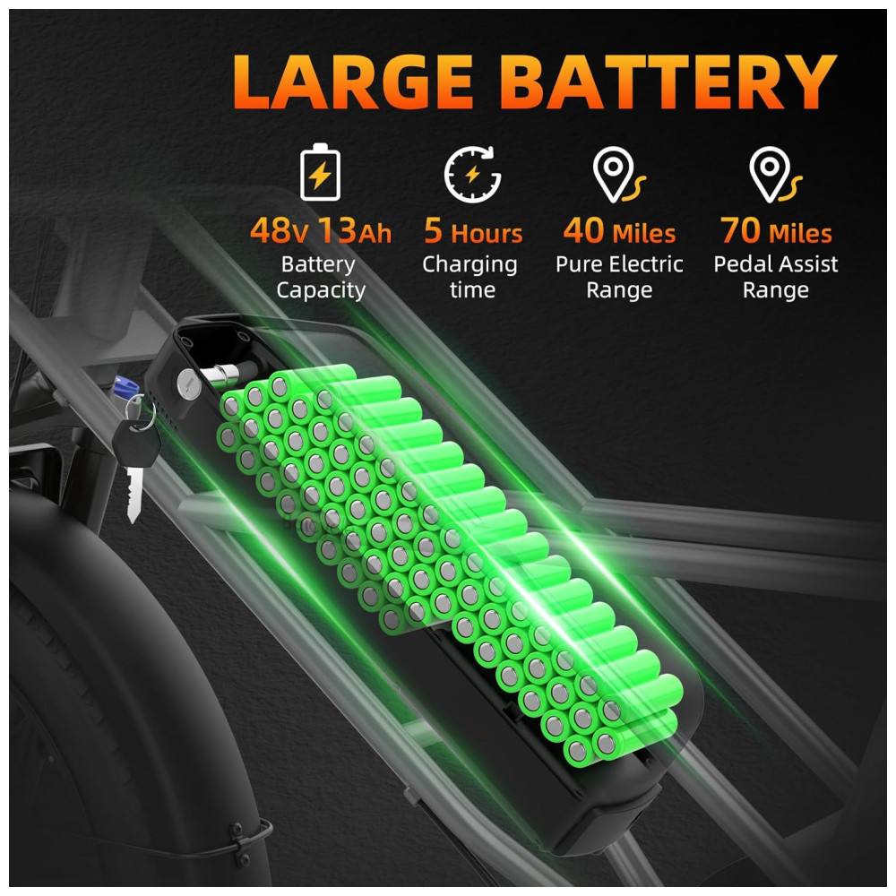 A bicicleta elétrica está equipada com uma bateria de lítio de alta capacidade de 48V 13Ah com energia total de 624Wh. A bateria adota tecnologia avançada antifurto, garantindo alta segurança. No modo de assistência de pedal, a autonomia supera 70 milhas, e no modo totalmente elétrico, atinge 40 milhas. Suporta carga rápida de 5-6 horas, é removível e possui classificação IP54 à prova d’água, tornando o carregamento conveniente independentemente do clima.
