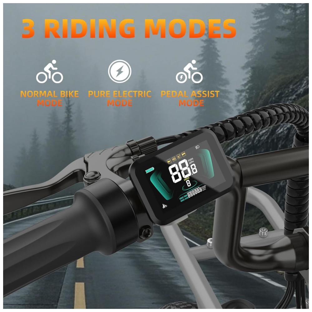 A E-Bike possui quatro modos de funcionamento para atender a diferentes necessidades de viagem. No modo totalmente elétrico, você pode viajar longas distâncias sem esforço. O modo de assistência oferece cinco configurações de velocidade para você escolher, atendendo a diversas preferências de velocidade. Quando precisar empurrar a bicicleta ladeira acima, ativar o modo de impulso pode reduzir significativamente o esforço necessário, permitindo empurrar a bicicleta com facilidade. No modo bicicleta, com pneus de 3.0 polegadas, o passeio é mais fácil e ágil.