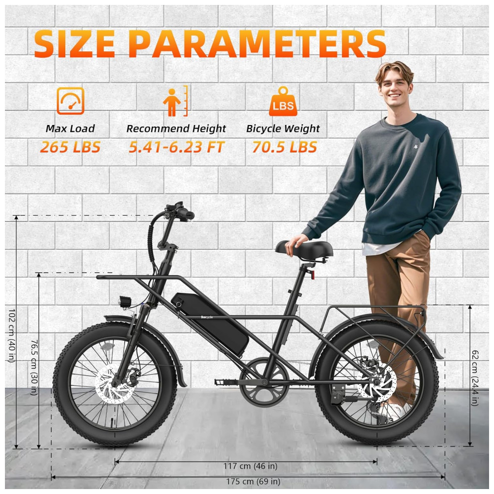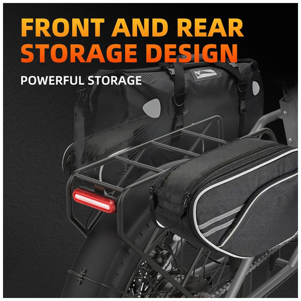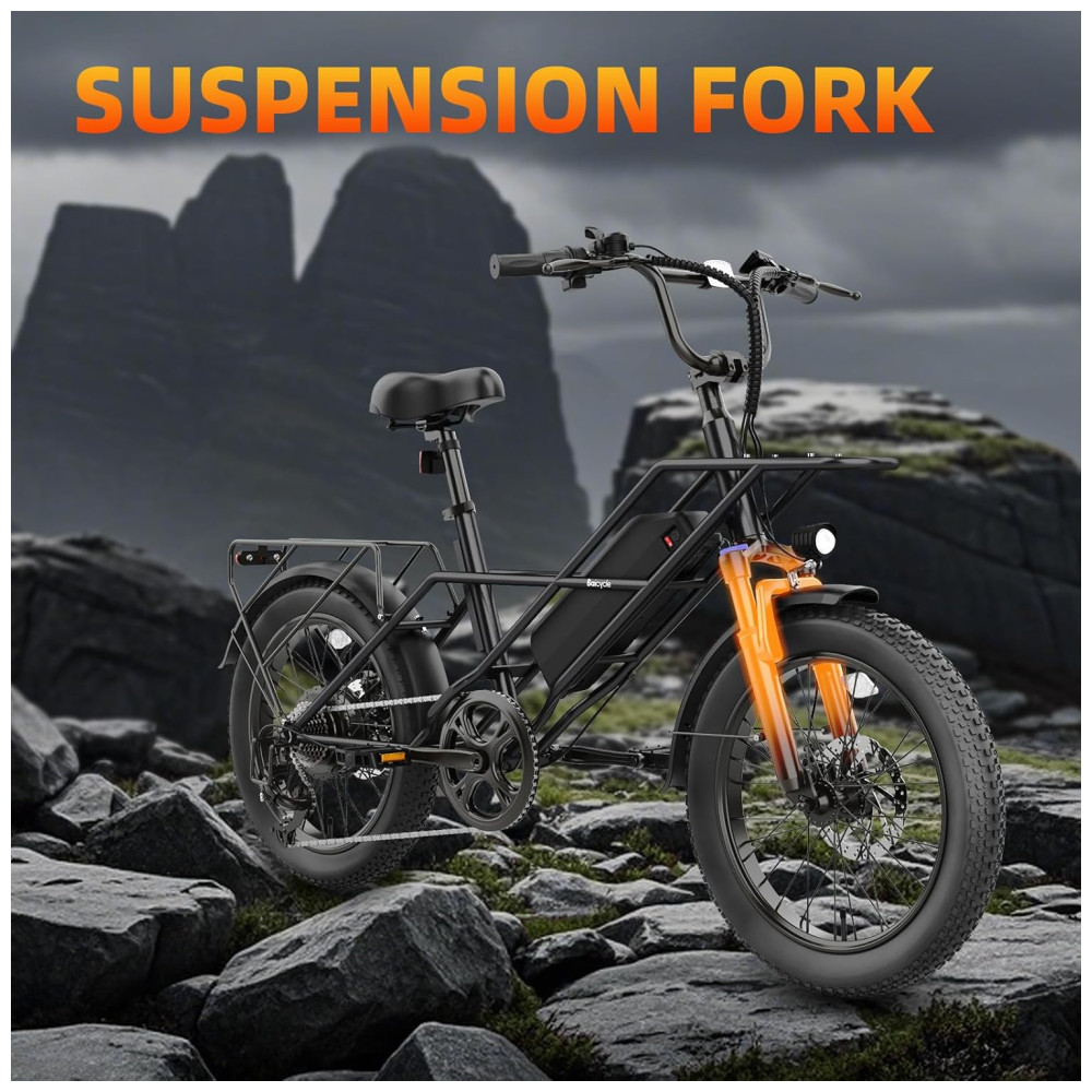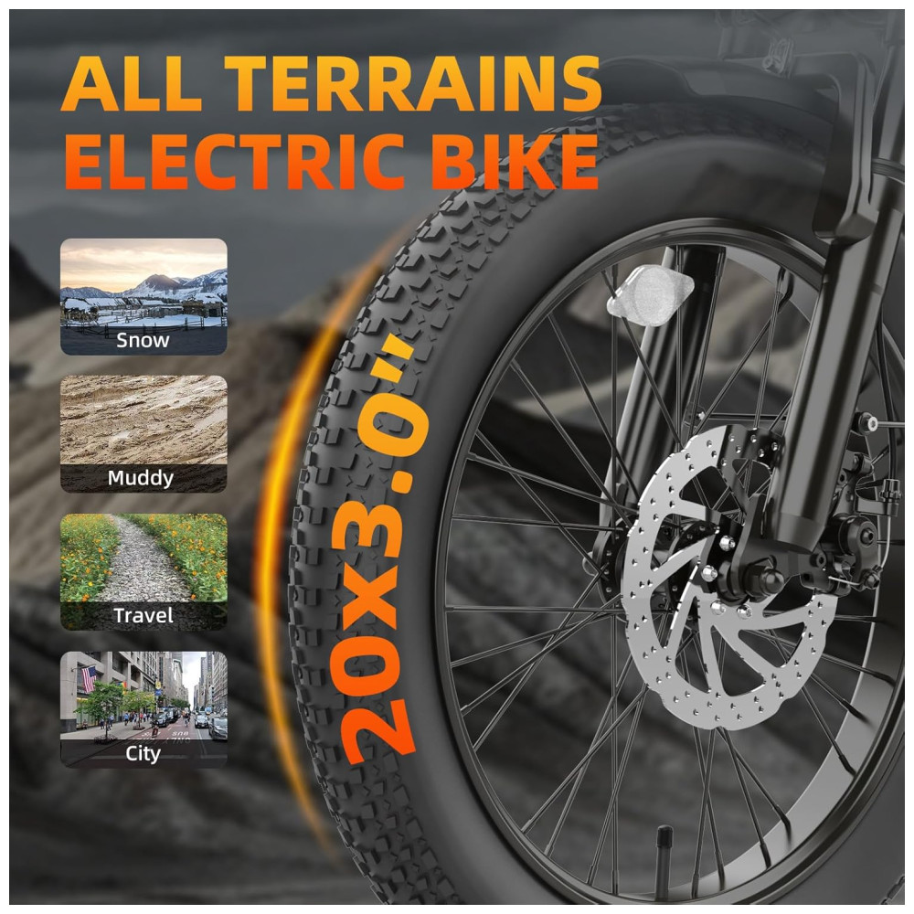 O garfo de absorção de choque de alta resistência está equipado com componentes de absorção de choque progressivos de seis camadas, amortecendo efetivamente as vibrações de estradas irregulares para uma pedalada mais suave. Com pneus largos de 20×3.0 polegadas, oferece aderência forte e pode lidar com chuva, neve, praias e estradas de montanha. Os freios a disco de aço inoxidável de 180mm, com frenagem sensível e estável, garantem paradas seguras a qualquer momento.