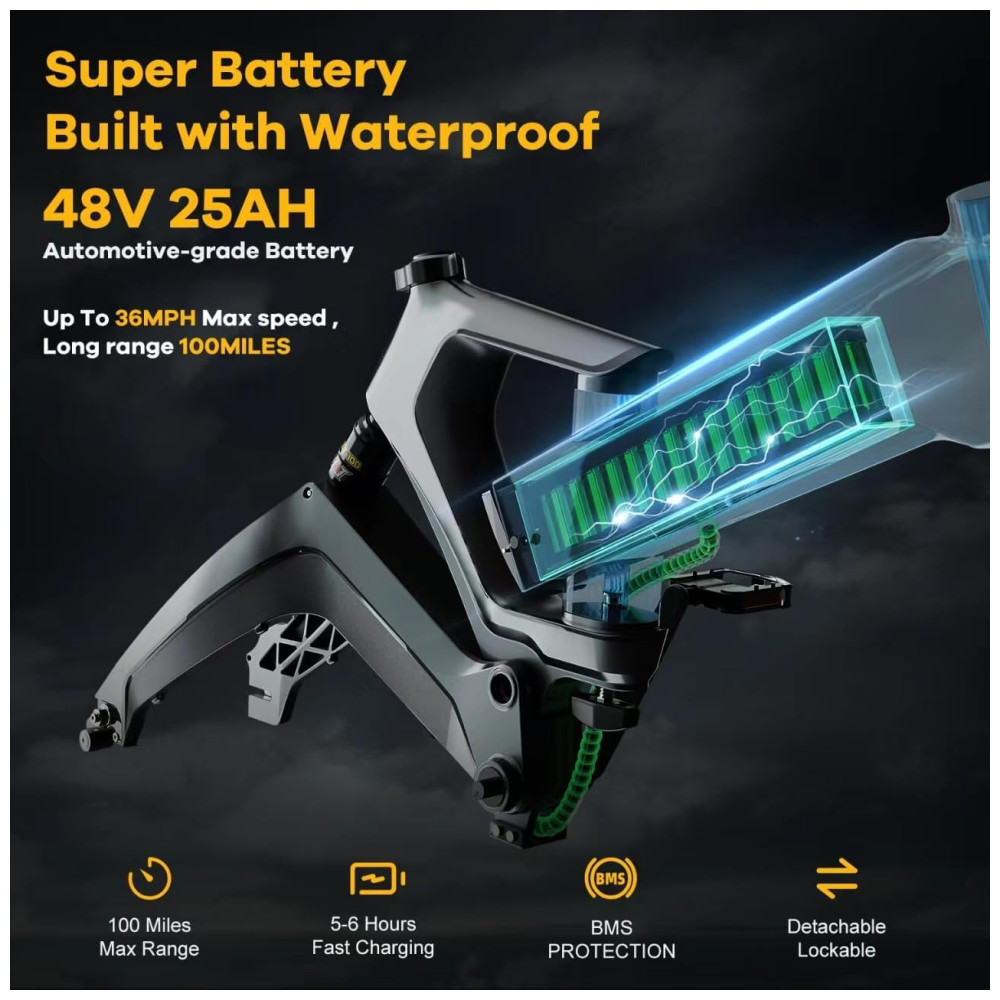A bicicleta elétrica Cybervelo EK6 Max 2.0 apresenta uma bateria super potente de lítio de 48V 25Ah, proporcionando uma impressionante autonomia de até 100 milhas no modo assistido, ideal para viagens longas. Seu motor de 1000W (pico de 2000W) atinge até 36 MPH, oferecendo 5 modos de operação. Com pneus largos de 4.0 polegadas e estrutura em liga de magnésio, a EK6 Max 2.0 se adapta a diversos terrenos, como neve, montanhas e cidades. O display LCD fornece informações em tempo real, garantindo uma experiência de pedal mais segura e confortável. A bicicleta é ideal para adultos e possui 8 velocidades, freios a disco e é dobrável para maior praticidade. Descubra a liberdade e a diversão de pedalar com a Cybervelo!
