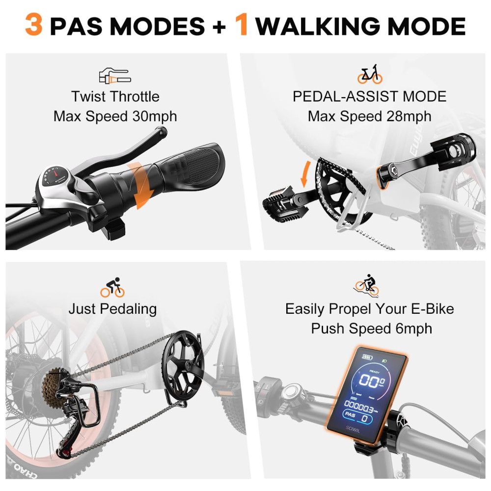 【Explore a aventura sem esforço】 A bicicleta elétrica Narrak oferece quatro modos para combinar com seu ritmo. Modo Caminhada para lazer, Modo Acelerador para passeios rápidos de até 45 km/h sem pedalar, Modo Pedal Assistido para um treino personalizado com alcances variados e Modo Bicicleta Regular para pedaladas tradicionais. É a combinação ideal de conveniência e versatilidade para qualquer jornada.