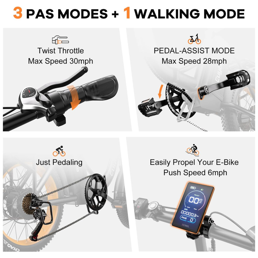 Esta bicicleta elétrica é alimentada por um motor sem escovas de 750 W (pico de 1000 W) e atinge facilmente uma velocidade máxima de 30 MPH. Com forte força motriz e capacidade de subir colinas, escalando encostas de 30°, você pode conquistar diversos terrenos, como praias, montanhas, neve e ruas urbanas. Se você gosta de emoções e desafios, também pode pilotar esta e-bike de montanha para uma aventura sem parar.