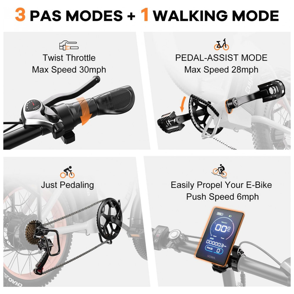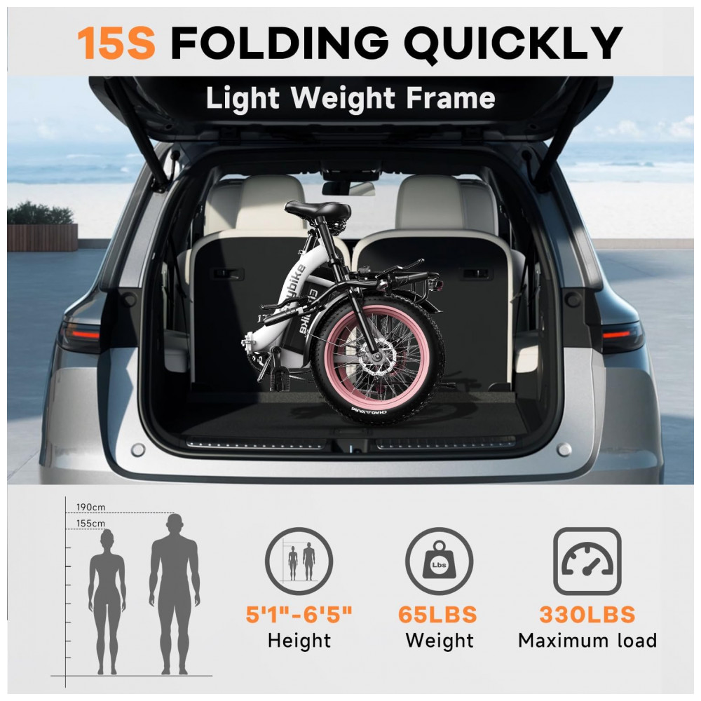 Experimente aventuras sem limites com a Bicicleta Elétrica Kebiko F7 Yellow Standard. Equipada com um motor sem escovas de 1000W, atinge facilmente 30 MPH. A bateria de lítio de 48V 20Ah oferece um alcance de até 80 milhas, com design removível para maior praticidade. Com suspensão dupla no assento e garfo dianteiro, freios a disco duplo e 7 marchas, esta e-bike proporciona conforto, segurança e desempenho excepcionais. Dobrável e compacta, ideal para o dia a dia na cidade, praia e neve. Aproveite os 3 modos de condução e 5 níveis de assistência para uma experiência personalizada. Com tela LCD que exibe velocidade, nível de bateria, distância percorrida e muito mais. Aproveite a liberdade de explorar novos caminhos com a Kebiko F7.