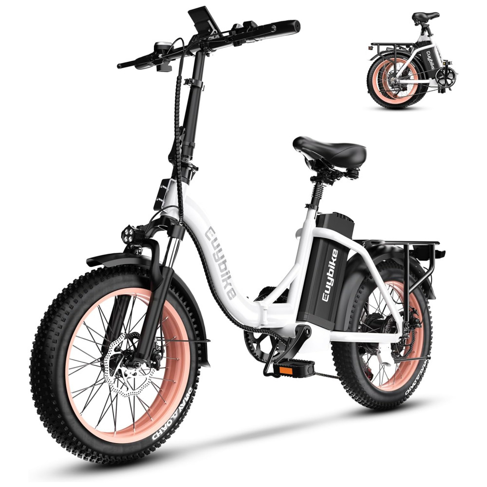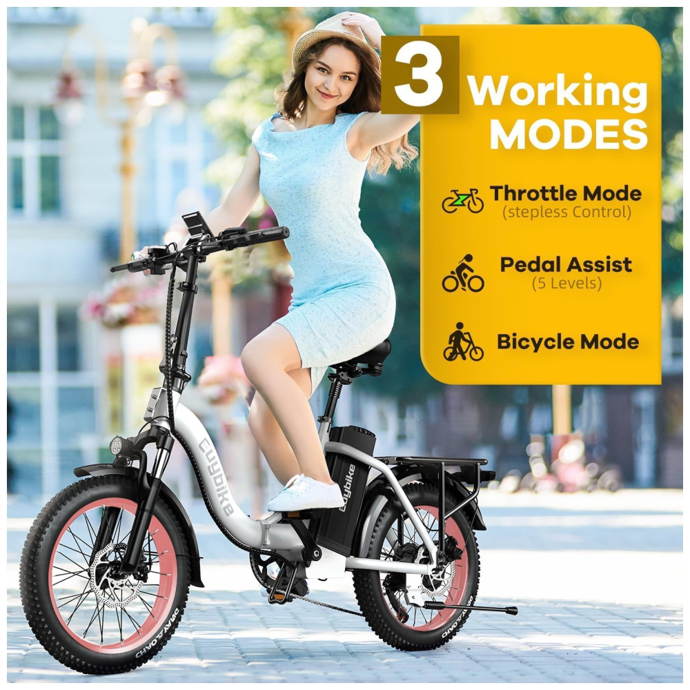 Bicicleta Elétrica Dobrável KEBIKO 750W Bateria 48V 20Ah Velocidade 48 km/h Suspensão Dupla Freios a Disco Rodas 20″ Display LCD Branco Rosa