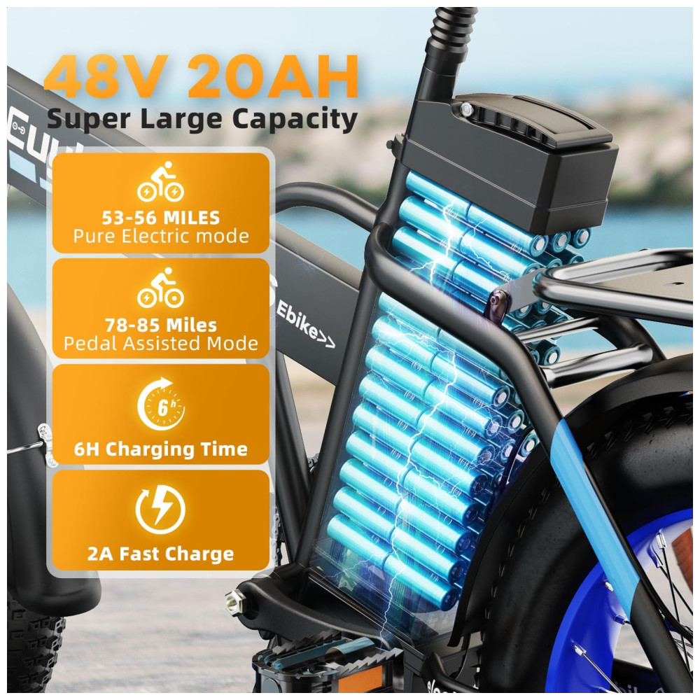 Ela utiliza uma bateria de grande capacidade de 48V 20AH para atender às necessidades de vida útil mais longa da bateria. O potente motor de 1000 pico, 82 Nm de torque e transmissão de sete velocidades facilitam a subida, sendo um item essencial para o deslocamento e um parceiro de aventura.
