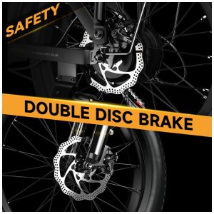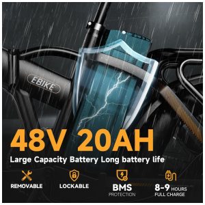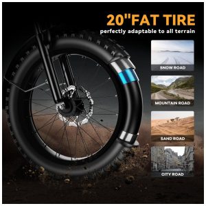 Condução segura e confortável: A bicicleta elétrica adota freio de desligamento automático EABS + freios a disco duplos dianteiros e traseiros para frenagem sensível. Ela foi projetada com forte desempenho off-road, força de frenagem confiável e alto fator de segurança. O garfo dianteiro e o canote de selim de alta resistência absorvem os solavancos de estradas longas e irregulares. Os pneus largos de 20″ são antiderrapantes e à prova de furos, garantindo que você possa pedalar em estradas, neve, praias e estradas montanhosas acidentadas.
