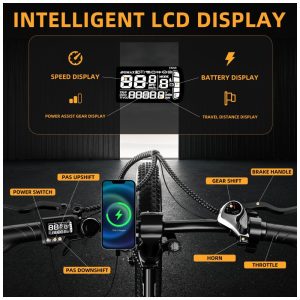 Modelo dobrável com 3 modos de pilotagem: O design dobrável permite que a bicicleta elétrica vá com você a qualquer lugar. Você pode colocar a bicicleta no seu carro e levá-la em uma viagem. Há três modos de pilotagem, cinco níveis disponíveis de assistência ao pedal e um sistema de transmissão profissional de 7 velocidades. O visor LCD inteligente com porta de carregamento exibe continuamente a velocidade em tempo real, a carga da bateria e quilometragem, permitindo que você controle seu status de pilotagem de e-bike a qualquer momento.