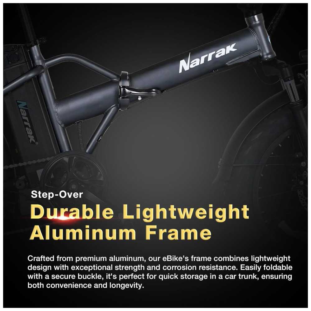 【Design Durável e Ergonômico】A Bicicleta Elétrica Narrak possui um quadro Step-Thru/Over robusto e dobrável e um garfo dianteiro com amortecimento de impacto para um passeio suave em qualquer terreno. Seu bagageiro removível e selim de alumínio de alta qualidade suportam até 127 kg, garantindo uma experiência de primeira qualidade em cada passeio.