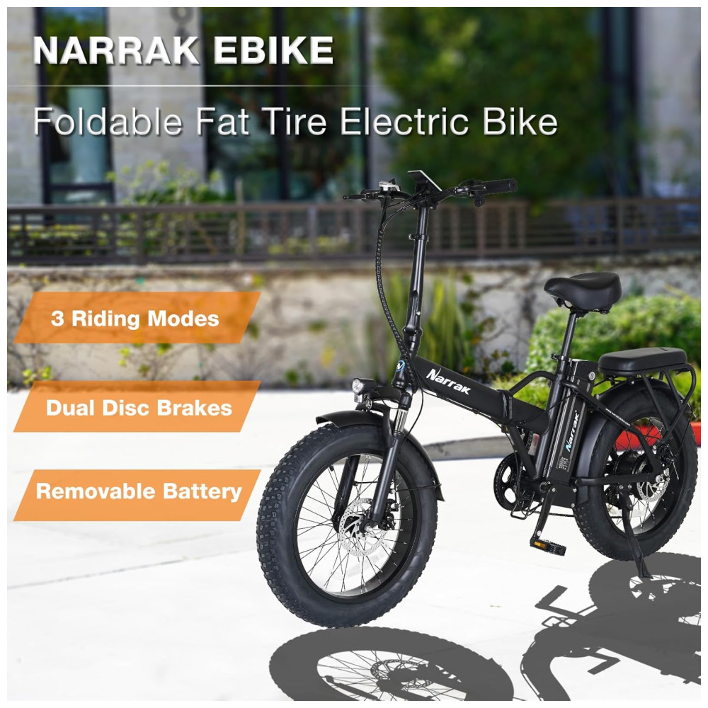 【Companheira Versátil para Aventuras】A Bicicleta Elétrica Dobrável Narrak com Pneus Grossos se destaca por combinar durabilidade off-road com a praticidade de ser dobrável, tornando-a um destaque no ciclismo elétrico. Ideal para aventuras em trailers, acampamentos, trilhas e passeios na praia ou calçadão, ela foi projetada para enfrentar qualquer terreno e é compacta o suficiente para caber em seu carro ou caminhão, garantindo uma configuração rápida para explorações sem fim.