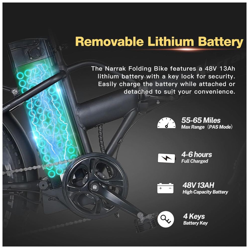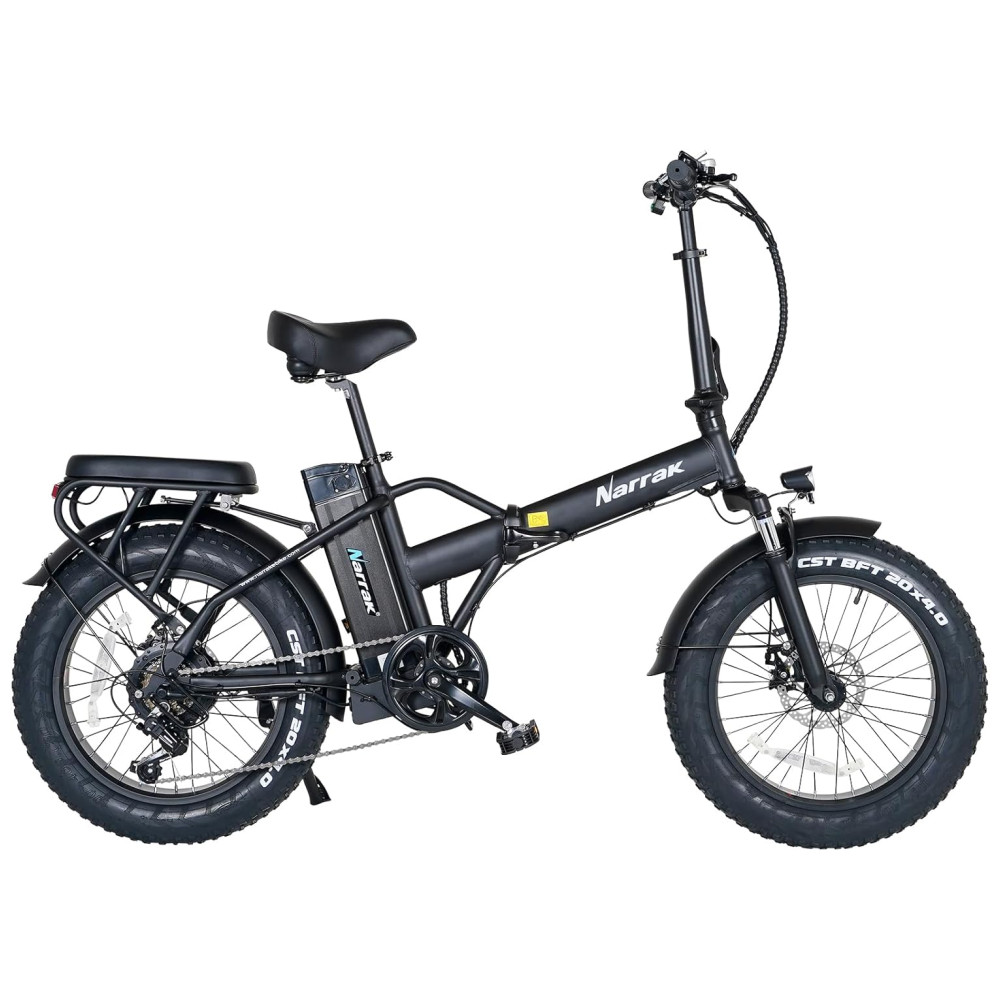 Apresentamos a Bicicleta Elétrica Dobrável de Pneus Grossos Narrak, uma fusão de potência, versatilidade e segurança projetada para elevar sua experiência de pedal. Equipada com um robusto motor de 750W, com pico de 1100W, e uma bateria de 48V 13,4Ah, atinge facilmente velocidades de até 45,1 km/h, tornando cada jornada emocionante.