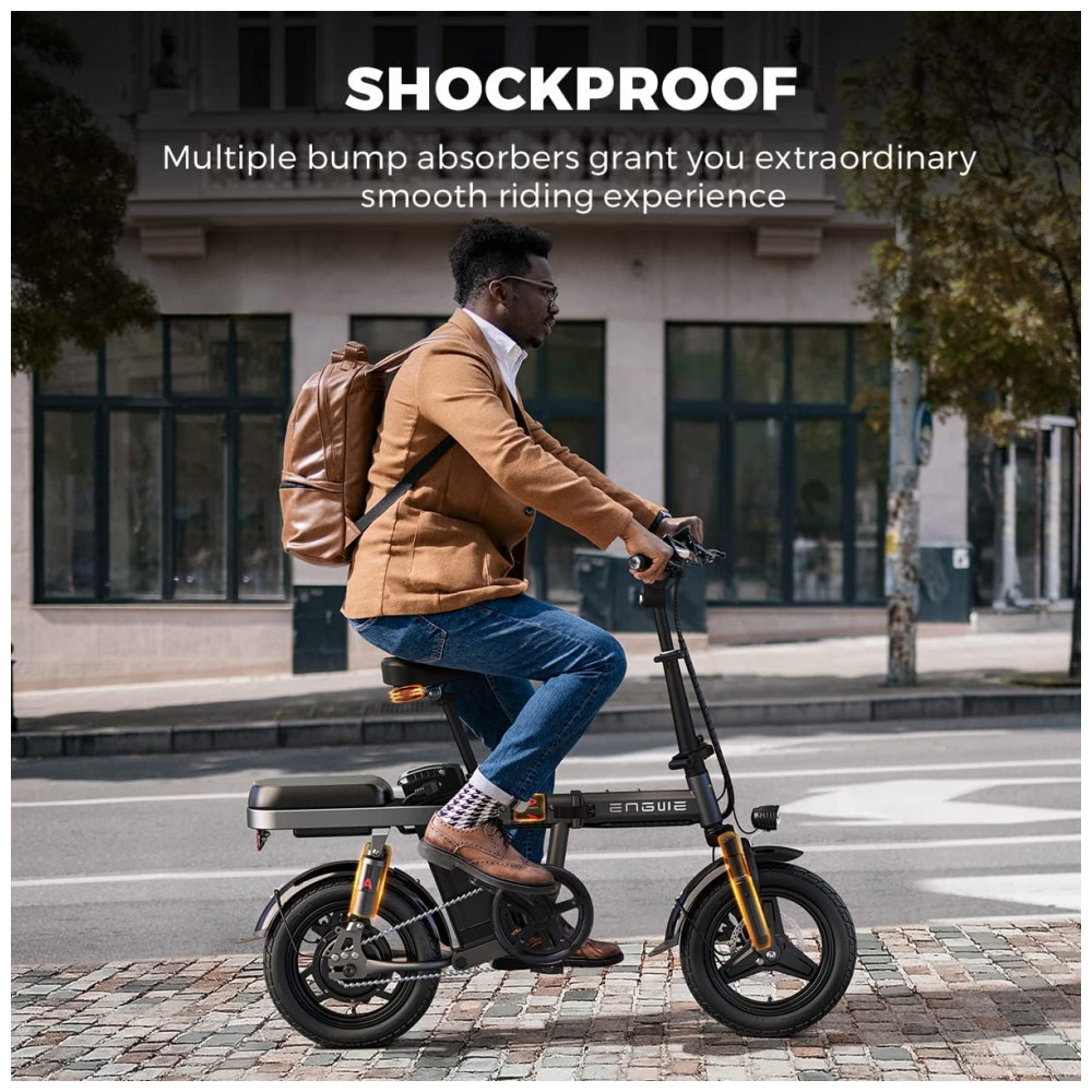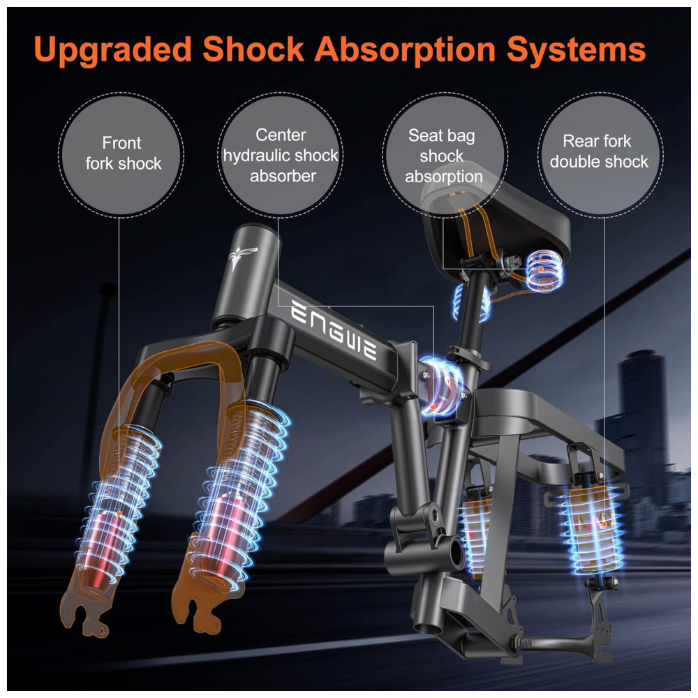 Absorção de choque múltiplo A bicicleta elétrica ENGWE T14 possui um sistema de absorção de choque múltiplo, incluindo garfo dianteiro, centro, roda traseira e selim. Isso, juntamente com seu design ergonômico, proporciona uma experiência de pilotagem confortável em todos os tipos de terreno e garante um passeio agradável.