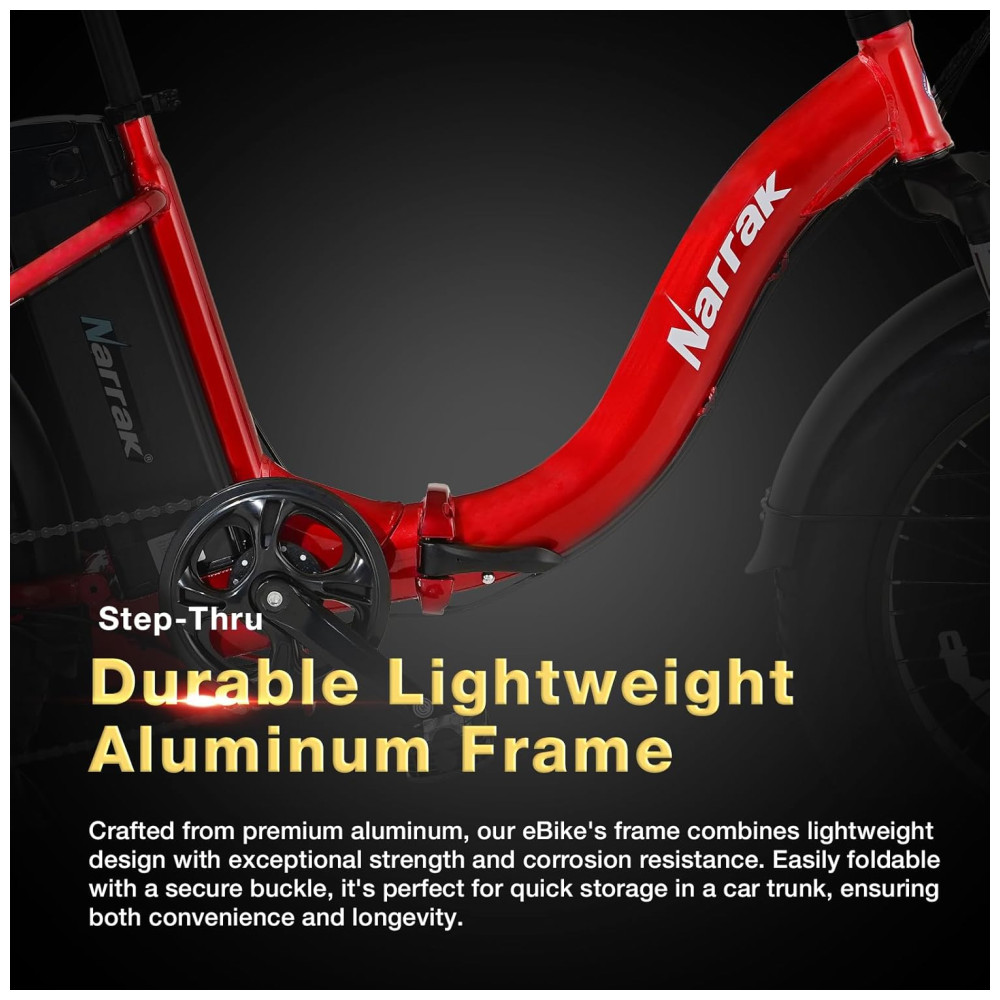 【Design Durável e Ergonômico】A Bicicleta Elétrica Narrak possui um quadro Step-Thru/Over robusto e dobrável e um garfo dianteiro com amortecimento de impacto para um passeio suave em qualquer terreno. Seu bagageiro removível e selim de alumínio de alta qualidade suportam até 127 kg, garantindo uma experiência de primeira qualidade em cada passeio.