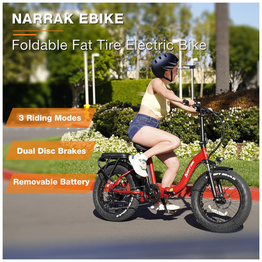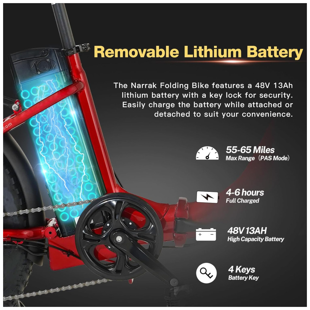 Bicicleta Elétrica Dobrável Narrak S129 Vermelho Motor Traseiro 750W (Pico 1100W) Bateria 48V 13Ah (624Wh) Pneus Largos 20″x4″ Freios a Disco Duplos Suspensão Dianteira e Transmissão SHIMANO 7 Velocidades e velocidade máxima de 45km/h Vermelho Step-