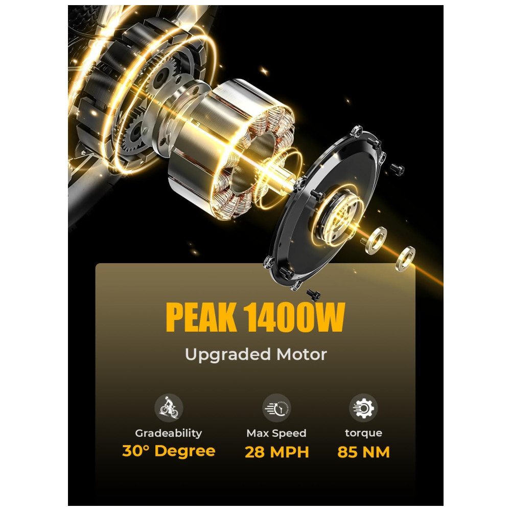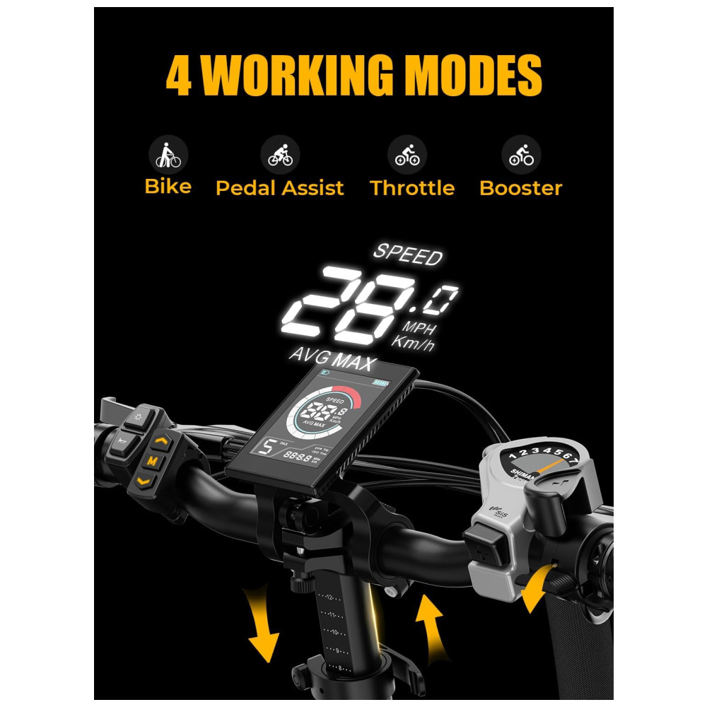 EXCELENTE DESEMPENHO DE CONDUÇÃO Personalize seu desempenho de condução com 3 modos de condução e marchas Shimano de 7 velocidades. Os freios a disco duplo perfeitos e o sistema de iluminação protegem totalmente sua segurança.