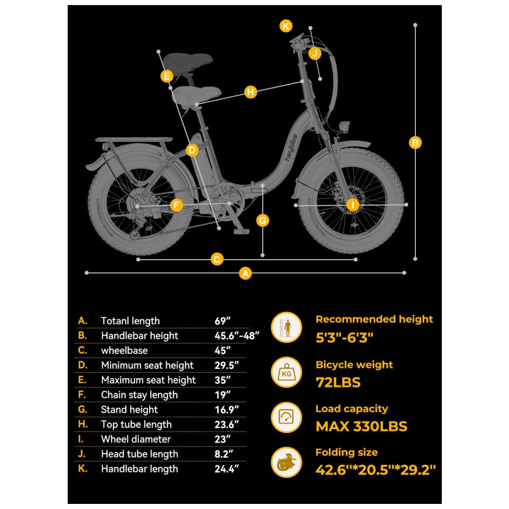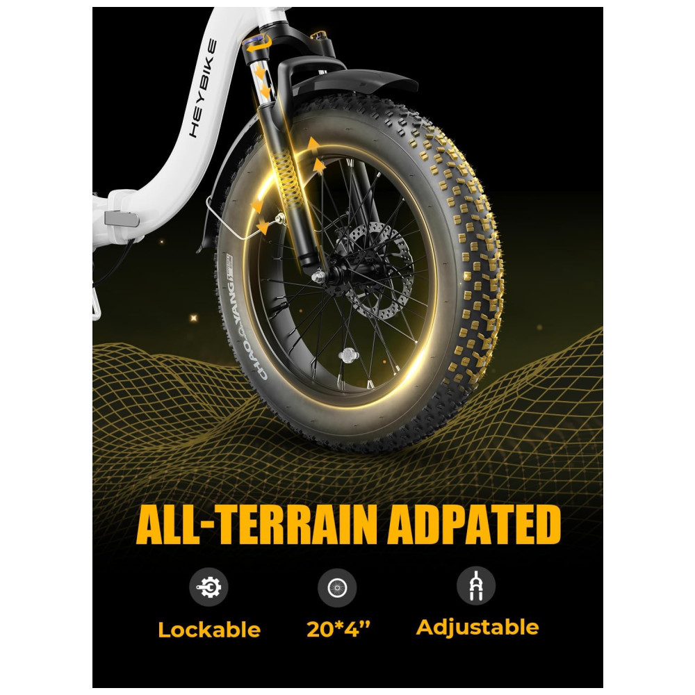 PNEUS GORDOS DE 12 CENTÍMETROS E AMORTECEDOR Os recém atualizados pneus gordos resistentes a perfurações de 121 centímetros têm melhor desempenho e uma aparência mais fria. Com excelente garfo dianteiro de suspensão e espigão de selim. Além das estradas da cidade, Heybike Ranger pode andar na neve, praias , estradas montanhosas acidentadas, etc.