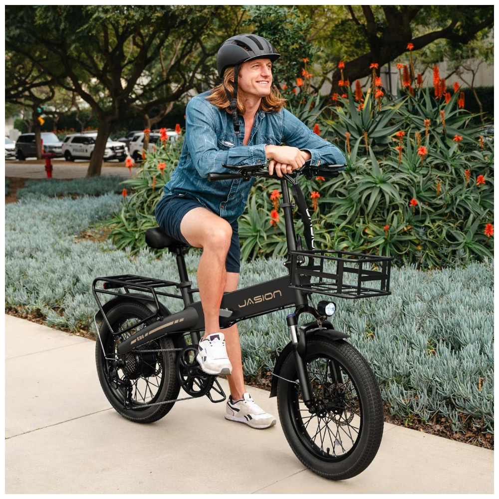 A bicicleta elétrica dobrável Jasion EB6 na cor preta com cesta dianteira é indicada para adultos em deslocamentos urbanos, estradas e trilhas leves, combinando quadro em alumínio com motor elétrico de pico de 1000W. A bateria embutida removível de íons de lítio 48V com 375Wh oferece autonomia de até cerca de 72 km em modo de assistência de pedal, com velocidade máxima aproximada de 37 km/h, variando conforme peso do usuário, relevo e modo selecionado.