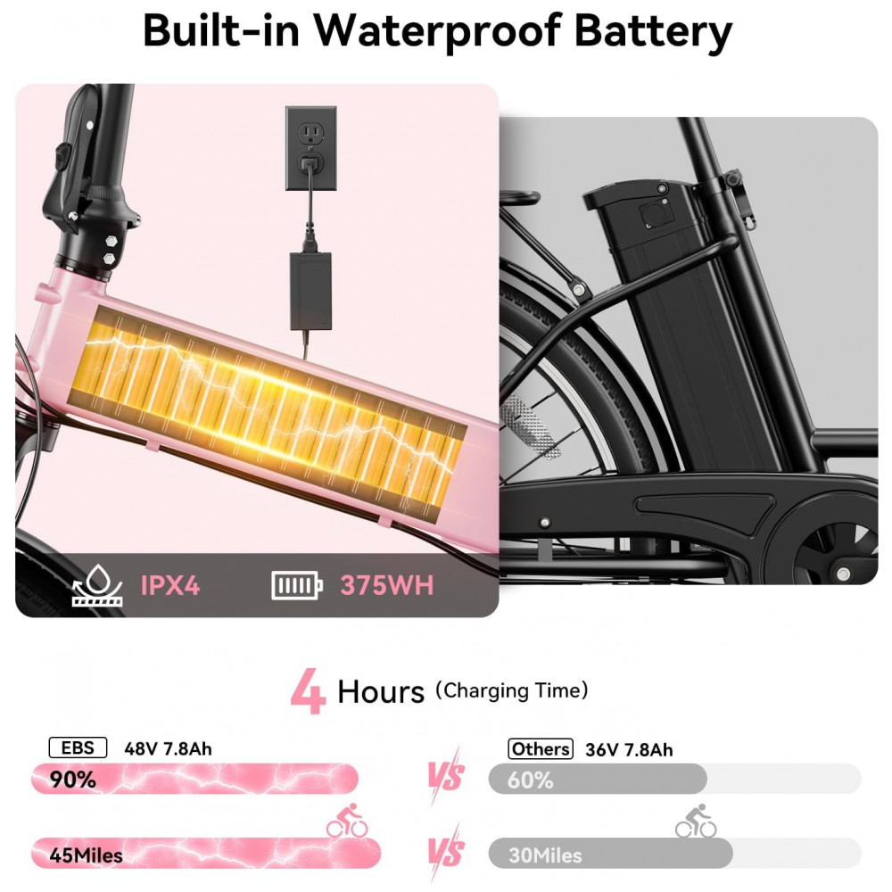 A bateria removível de aproximadamente 375Wh–504Wh (48V com capacidade em torno de 10,5Ah) oferece até cerca de 72km de autonomia em modo de assistência de pedal em nível reduzido, com recarga feita diretamente na bicicleta ou removendo a bateria para carregamento separado. O sistema de gerenciamento eletrônico de bateria contribui para a estabilidade elétrica e segurança na recarga. A EB6 suporta carga máxima próxima de 150kg, incluindo ciclista e bagagem, e vem acompanhada de carregador, pedais, chaves e kit de ferramentas para montagem.
