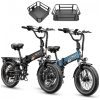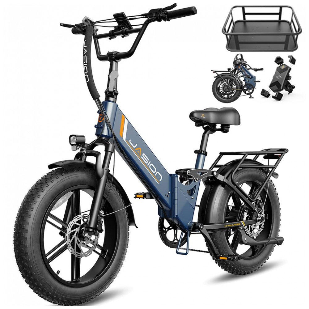Bicicleta elétrica dobrável Jasion EB7 2.0 azul com cesto traseiro pneus 20×4 motor 750W pico 1400W bateria 48V 13Ah 70 km 110V