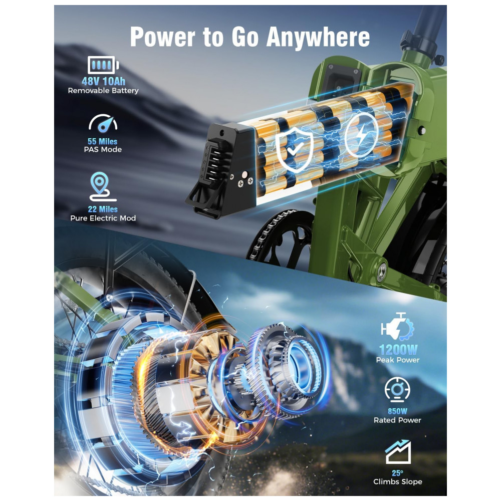 O sistema elétrico utiliza motor traseiro brushless com cerca de 750W de potência nominal e até 1200W de potência de pico, permitindo atingir velocidades de até aproximadamente 45 km/h, com torque próximo de 55Nm para auxiliar em aclives de até cerca de 25°. A bateria de íons de lítio de 48V e 10Ah, com energia de 480Wh, é removível e recarregável, oferecendo autonomia estimada entre aproximadamente 35 km e 55 km por carga em modo de assistência ao pedal, variando conforme o relevo, o peso do usuário e o nível de assistência selecionado.
