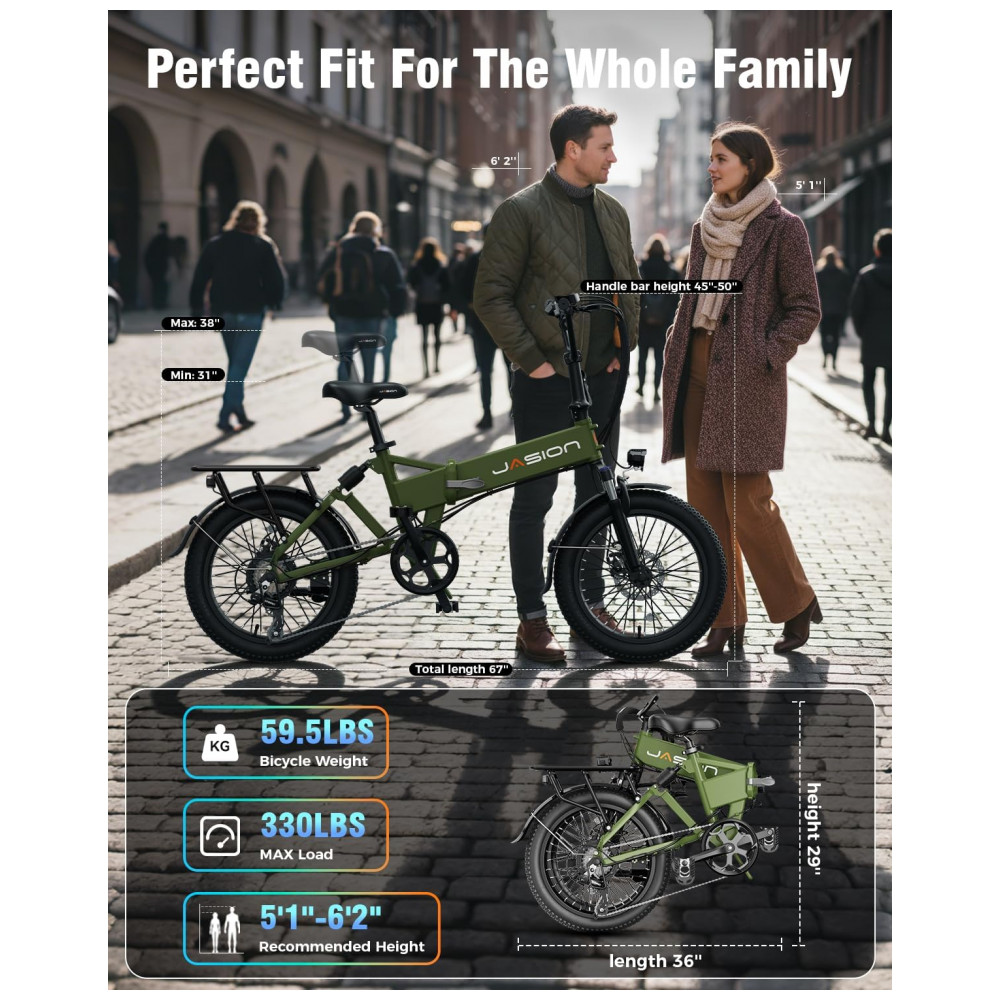 A bicicleta elétrica dobrável Jasion EB7 2.0 preta profunda é uma e-bike compacta com pneus largos 20×3, indicada para adultos que precisam de um meio de transporte elétrico versátil para uso em terrenos mistos, incluindo cidade, cascalho, praia, neve leve e trilhas leves. O quadro dobrável em aço carbono, em conjunto com a suspensão dupla e os pneus fat resistentes a furos, favorece estabilidade, absorção de impactos e aderência em diferentes tipos de superfície.