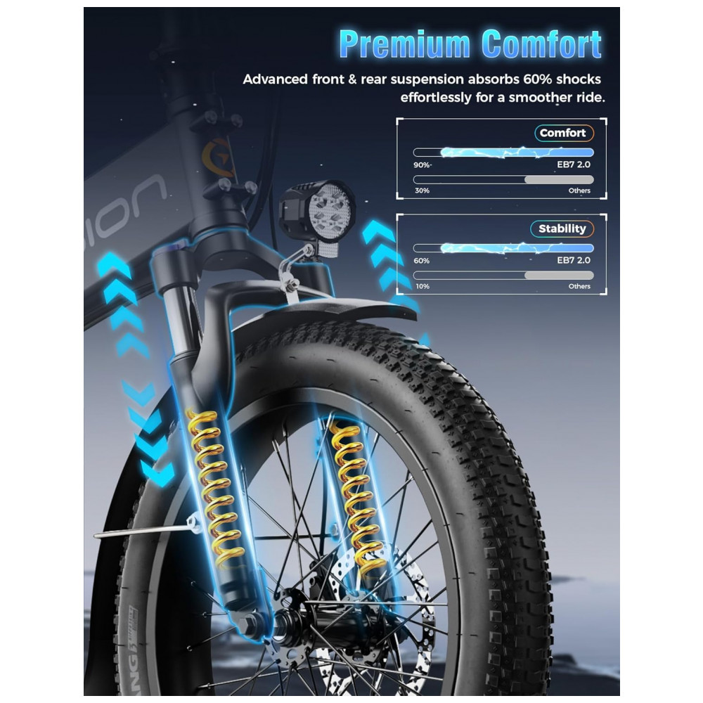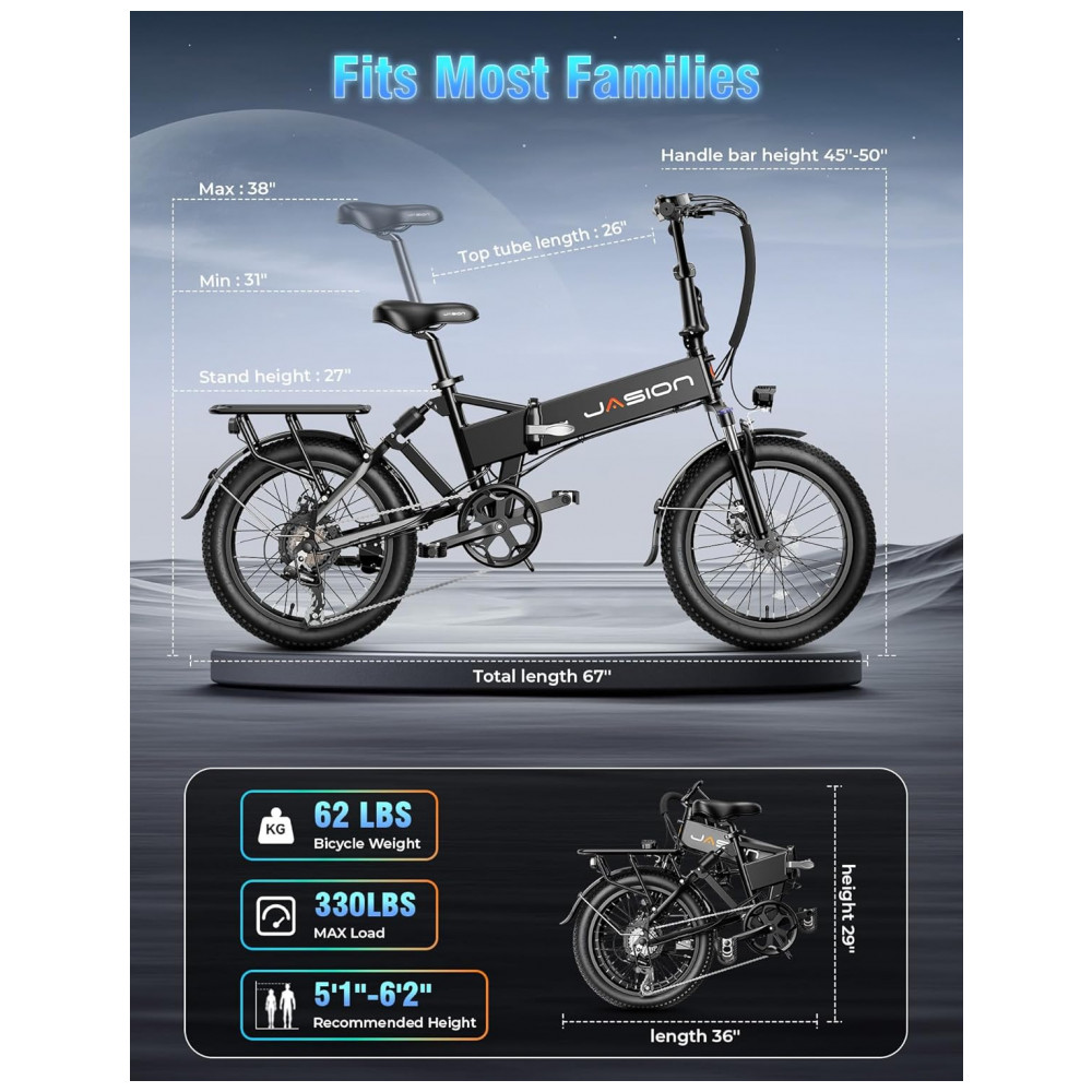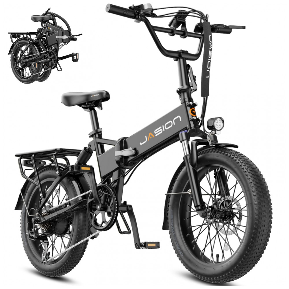 A bicicleta elétrica dobrável Jasion EB7 preto profundo é uma e-bike compacta com pneus largos 20×3, indicada para uso adulto em deslocamentos urbanos, estradas de cascalho, neve leve e percursos recreativos em diferentes tipos de terreno. O quadro em aço carbono com sistema de suspensão dianteira e traseira, combinado aos pneus fat resistentes a furos, contribui para maior estabilidade, conforto e absorção de impactos em pavimento irregular, guias e trilhas leves.