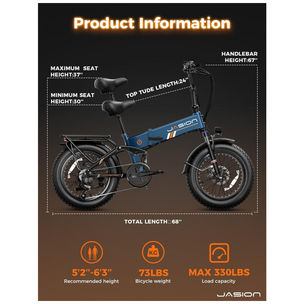 Bicicleta elétrica dobrável Jasion Hunter Pro azul meia-noite pneu grosso 20″ motor 1000W pico 1800W bateria 48V 15Ah até 128 km 110V