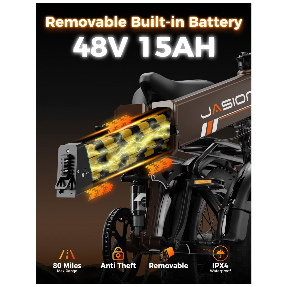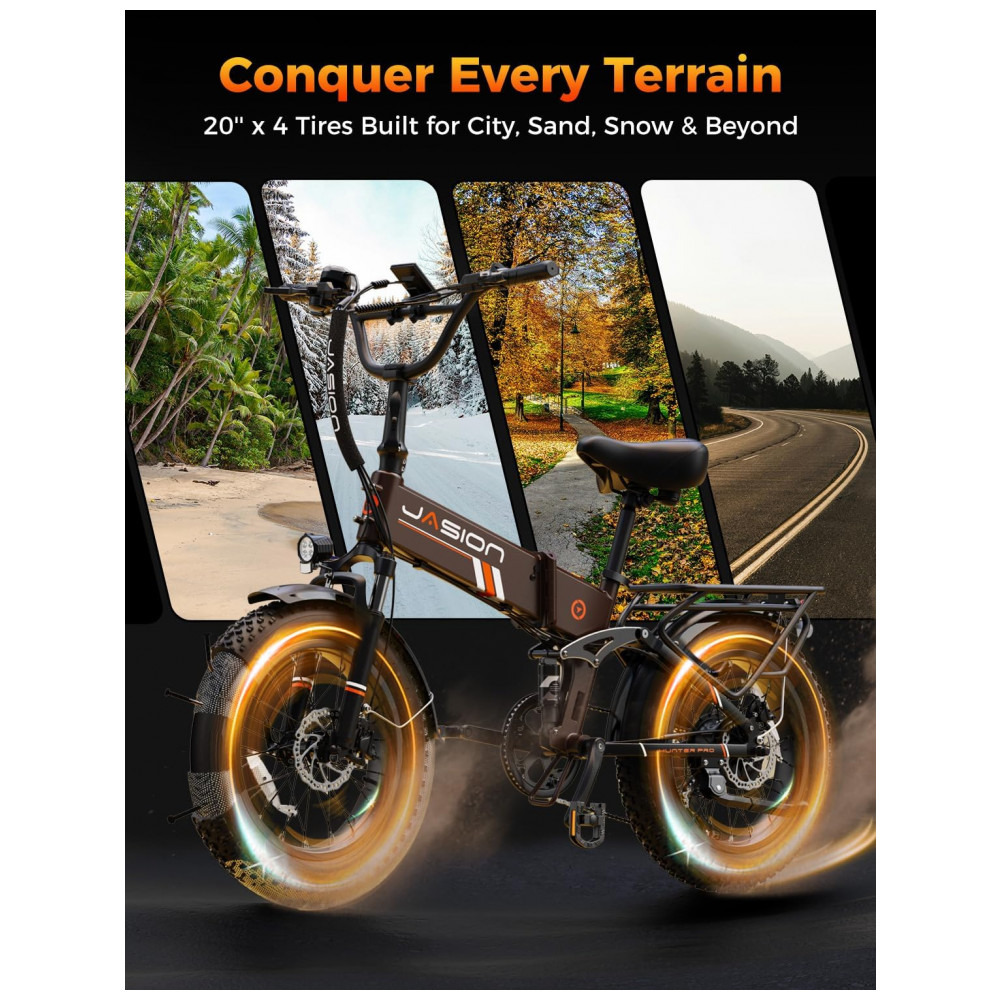 Bicicleta elétrica dobrável Jasion Hunter Pro marrom deserto pneu grosso 20″ motor 1000W pico 1800W bateria 48V 15Ah até 128 km 110V