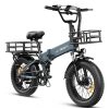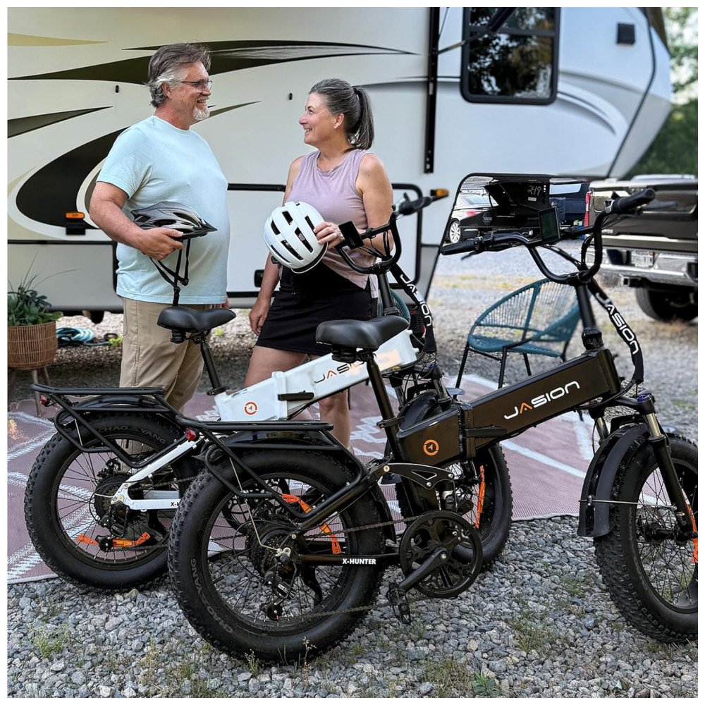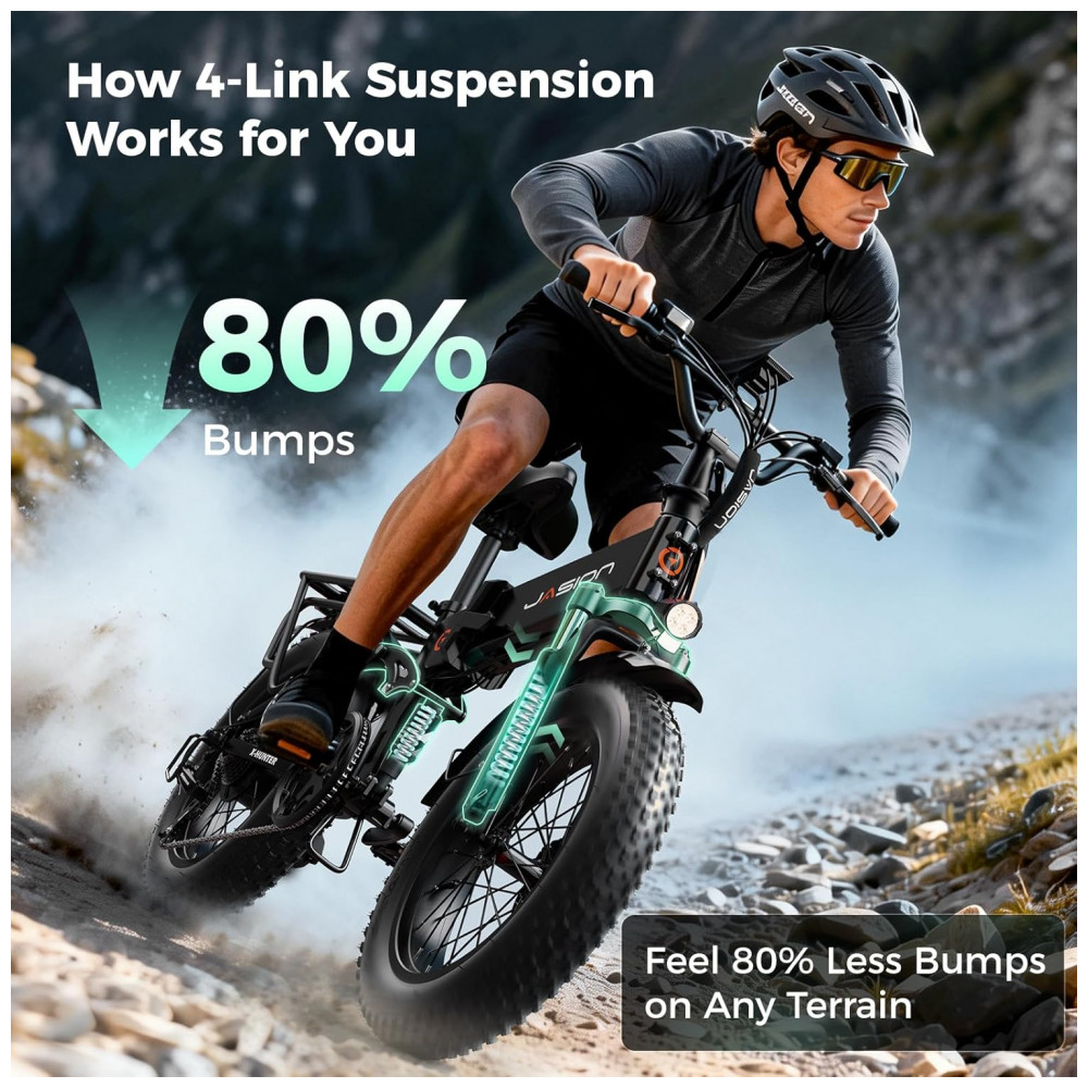 A bicicleta elétrica dobrável Jasion X-Hunter preta é indicada para uso adulto e combina quadro em alumínio com pneus largos 20×4, oferecendo estabilidade em vias urbanas e trilhas leves. O sistema de suspensão dupla, com amortecimento dianteiro e traseiro, reduz impactos e vibrações, contribuindo para maior conforto em deslocamentos diários e percursos mais longos.