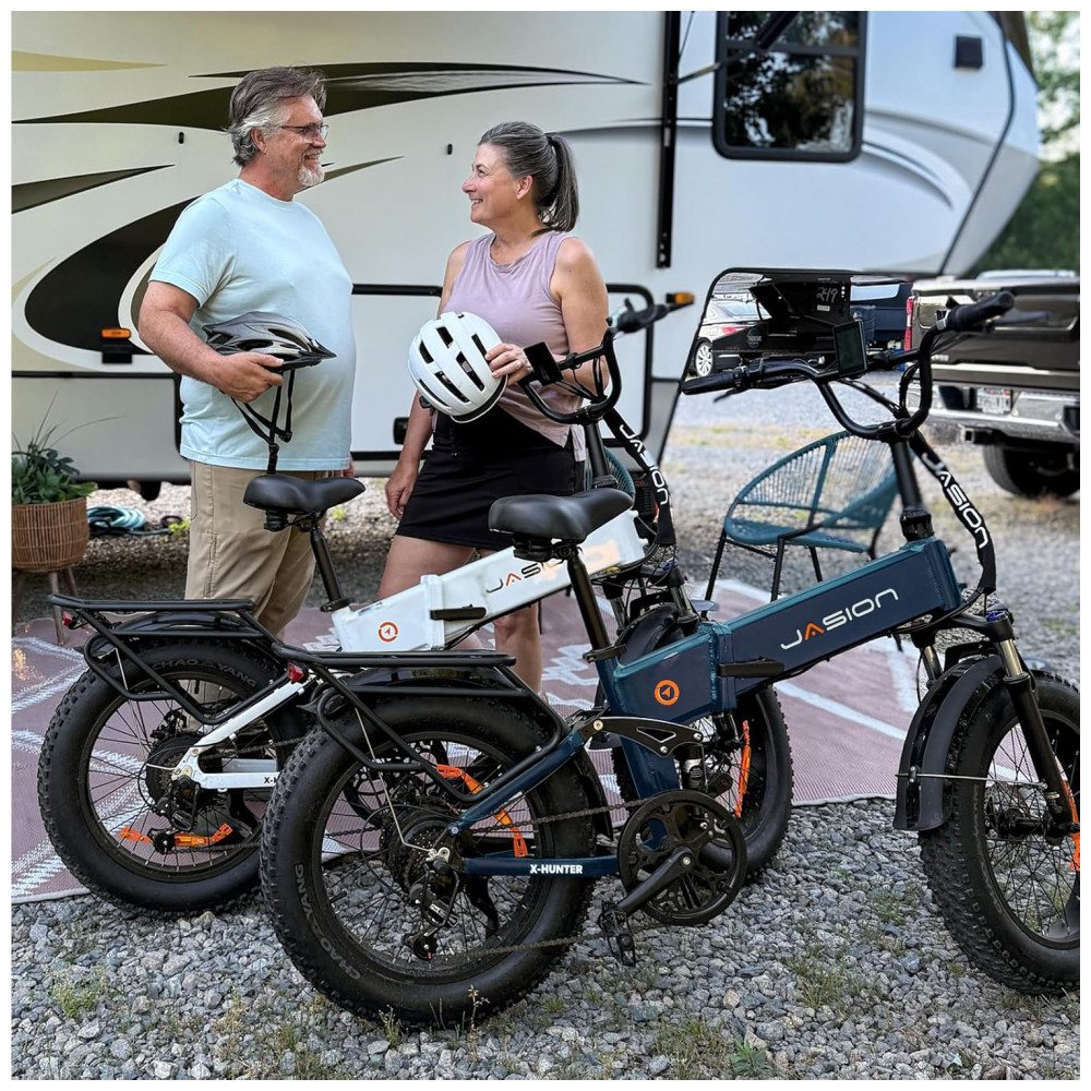 A bicicleta elétrica dobrável Jasion X Hunter foi desenvolvida para uso adulto em diferentes tipos de terreno, combinando quadro em alumínio, pneus largos 20 x 4 e sistema de suspensão total para maior controle e conforto. O motor elétrico traseiro de 750W, com potência de pico de 1400W e torque de 85 Nm, atua em conjunto com a bateria de íons de lítio 48V 13Ah removível, oferecendo autonomia aproximada entre 90 e 110 km por carga, com assistência elétrica e câmbio de 7 velocidades.