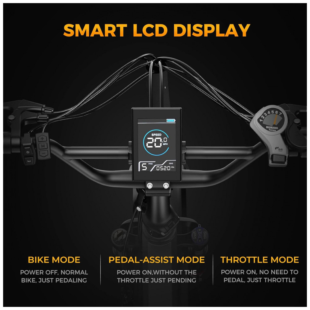 Os pneus fat 20×4 resistentes a furos oferecem maior área de contato com o solo, garantindo melhor aderência em superfícies soltas como areia e neve, além de maior conforto em asfalto irregular e calçamentos danificados. O sistema de suspensão combina garfo dianteiro com curso adequado para absorver impactos e suspensão traseira com articulação em múltiplos pontos, reduzindo vibrações e irregularidades, o que torna a condução mais estável e confortável em trajetos longos.