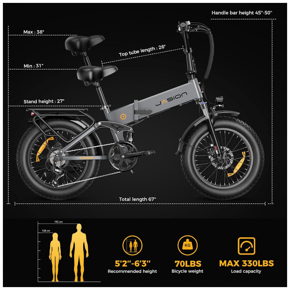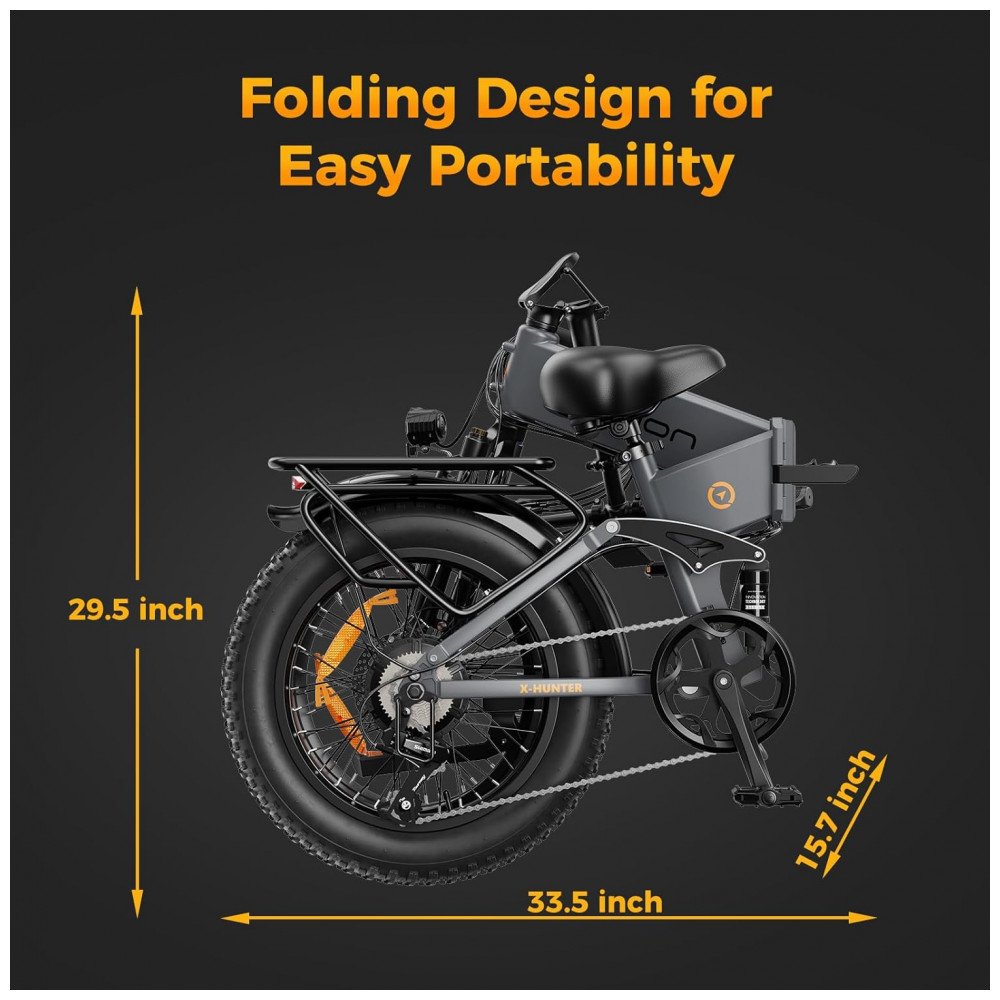 A bicicleta elétrica dobrável Jasion X-Hunter cinza grafite é uma e-bike fat tire 20×4 para adultos, projetada para deslocamentos urbanos e aventuras em trilhas, cascalho, areia e neve leve. O modelo utiliza quadro em alumínio dobrável, suspensão dupla e motor traseiro brushless com até 1400W de potência de pico, capaz de alcançar cerca de 48 km/h (30+ mph), oferecendo boa aceleração e tração estável em diferentes tipos de terreno.