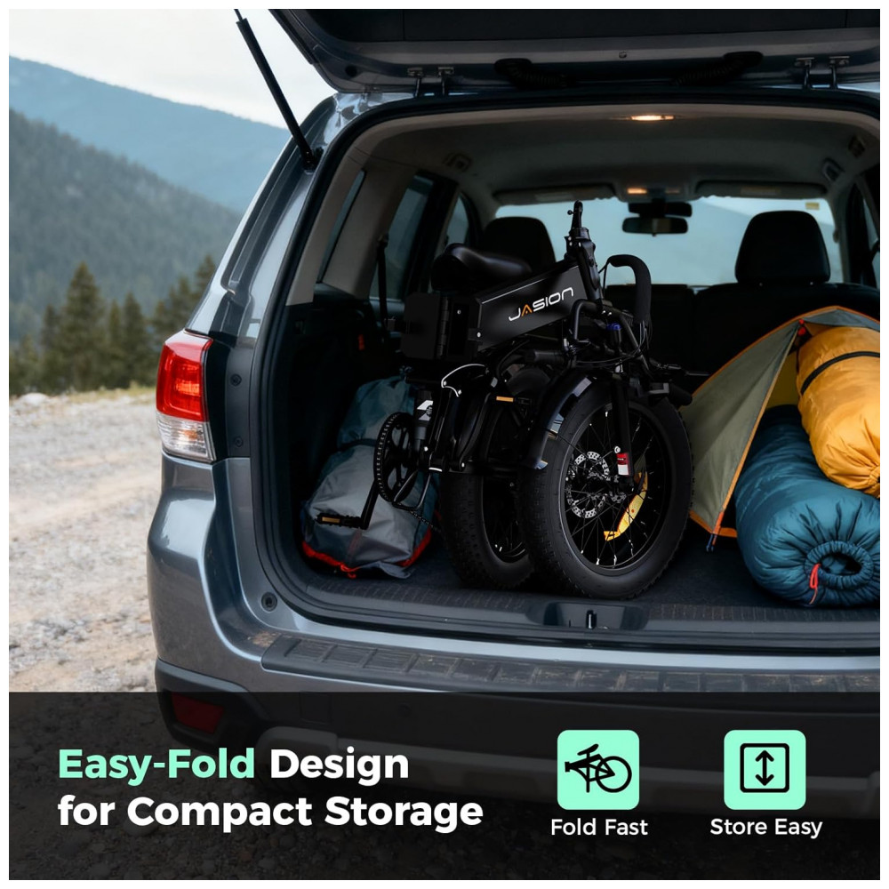 Bicicleta elétrica dobrável Jasion X Hunter preta com cestos motor 750W pico 1400W pneus 20×4 bateria 48V 13Ah suspensão dupla 110V