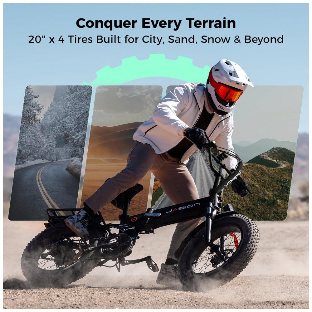 A bicicleta elétrica dobrável Jasion X-Hunter preta obsidiana é uma e-bike fat tire 20×4 para adultos, projetada para quem busca desempenho e portabilidade em deslocamentos urbanos, trilhas leves, cascalho, areia e neve leve. O modelo utiliza quadro em alumínio dobrável no tamanho compacto, suspensão dupla e motor de cubo traseiro brushless com até 1400W de potência de pico, atingindo velocidades próximas de 48 km/h (30+ mph) com boa aceleração e tração em terrenos de baixa aderência.