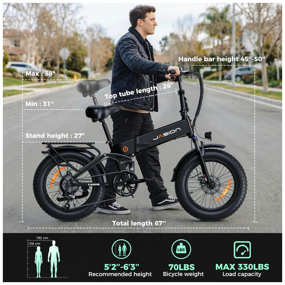 A bicicleta elétrica dobrável Jasion X Hunter preto stealth é indicada para uso adulto em deslocamentos urbanos e trajetos em terrenos variados, combinando quadro em alumínio com pneus largos 20″ x 4,0″ para maior estabilidade e tração. O motor traseiro brushless de 750W, com potência de pico de 1400W, permite alcançar velocidades em torno de 48 km/h, oferecendo bom desempenho em acelerações e subidas dentro das condições de uso recomendadas.