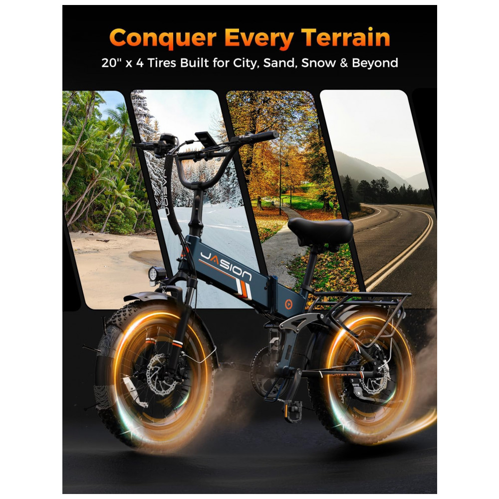 A bicicleta elétrica dobrável Jasion X-Hunter Pro azul com cesto traseiro foi desenvolvida para adultos que buscam um modelo compacto e robusto para deslocamentos urbanos e uso em diferentes tipos de terreno. O conjunto reúne quadro em alumínio, pneus largos 20 x 4 e suspensão dupla, proporcionando maior estabilidade e conforto em vias pavimentadas, estradas de cascalho, neve e trilhas leves.