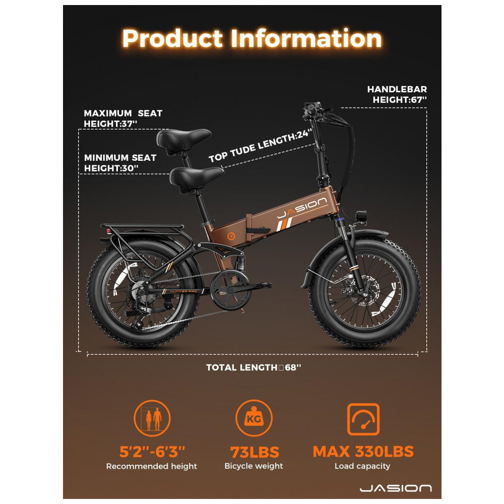 A bicicleta elétrica dobrável Jasion X-Hunter Pro marrom com cesto traseiro foi desenvolvida para adultos que precisam de um modelo resistente para deslocamentos urbanos, trilhas leves e uso em terrenos variados. O quadro em alumínio, combinado com pneus largos 20 x 4 e suspensão dupla tipo soft tail, proporciona estabilidade e absorção de impactos em pavimento, cascalho, trilhas e superfícies de menor aderência.